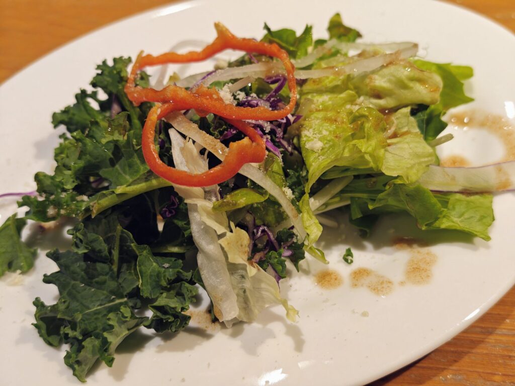 大根、レタス、パプリカ、ルッコラを使ったシンプルなサラダ。酸味&甘味のあるドレッシングで味付けされていました。