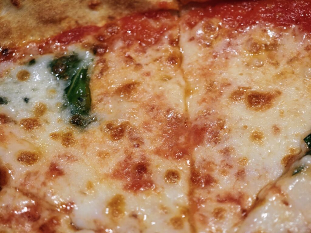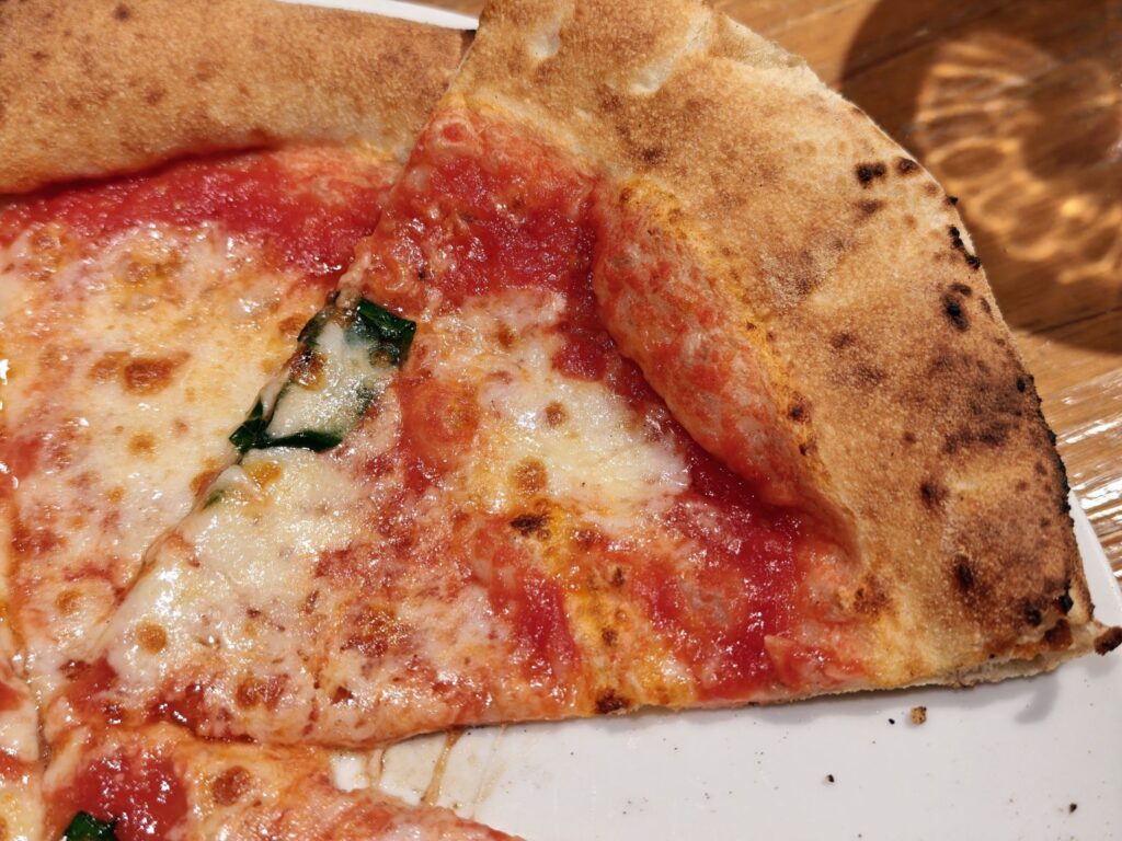 画像の通りモッツァレラチーズは焦げ目がついており香ばしいです。トマトソースは酸味感抑えめで万人が食べやすいタイプの味付け。ジュクジュクとした汁気の多さもなく手で持って食べやすいピッツァに仕上がっていました。