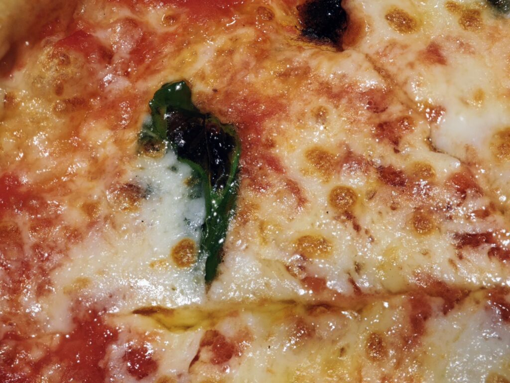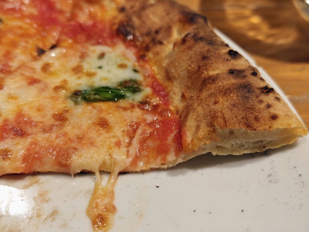 よそのナポリピッツァの店だと空気の気泡を沢山入れて生地を練ることでふんわりエアリーな食感を出す事が多いのですが、ナポリマニアさんの生地は比較的気泡が少なめでぺたっとした歯ざわりです。その分、ピッツァ表面の小麦粉が焼けて酸化する事で起こるメイラード反応由来の香りの良さやさっくり感に長じた生地質ですね。
