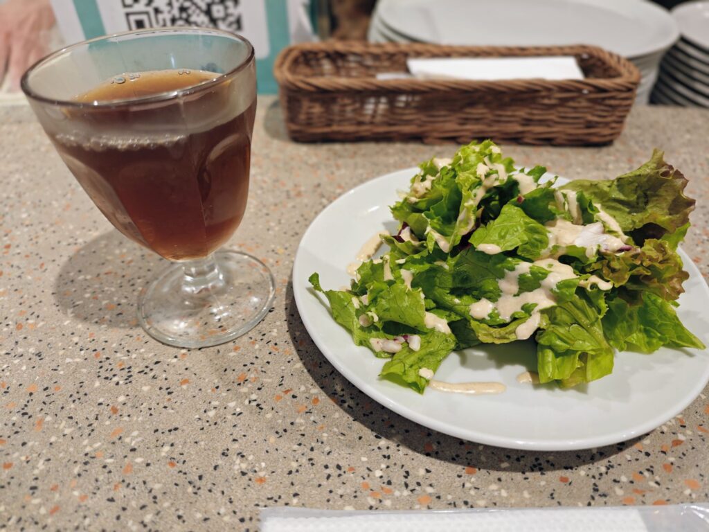 平日ランチセットはグリーンサラダとアイスピーチティ付(飲み放題)。ランチタイムでもアラカルトメニューを注文できるようです。