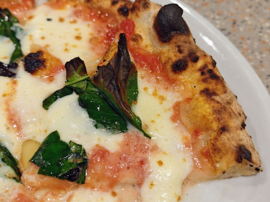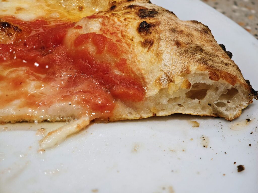 ピッツァ1切れを三つ指で持ち上げると指にうっすらと打ち粉がまとわりついてきます。犬歯を立てて噛むと画像のとおりに外側はサクッと、内側は羽二重餅のように滑らかで柔らかくもモッチリとした弾力感が余韻として残ります。
