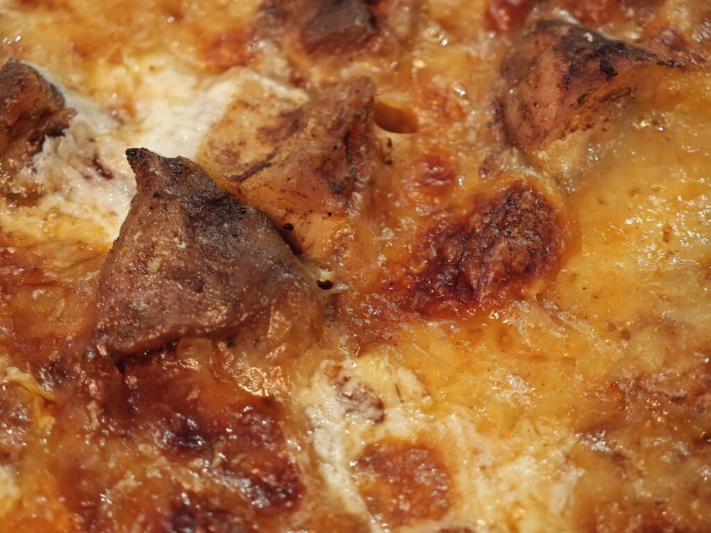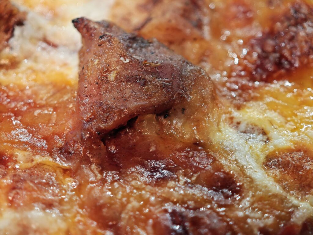 チーズの種類は不明ですが、表面がキツネ色になるまでこんがり焼かれている。香ばしく表面カリカリの内側トロトロで美味。