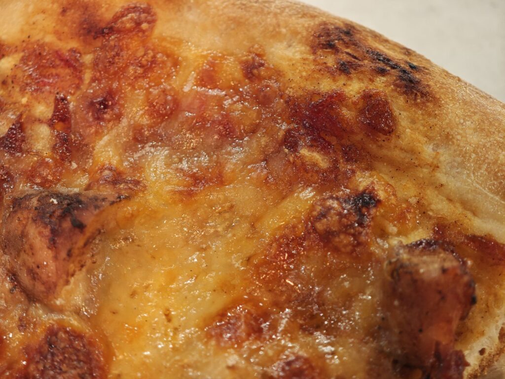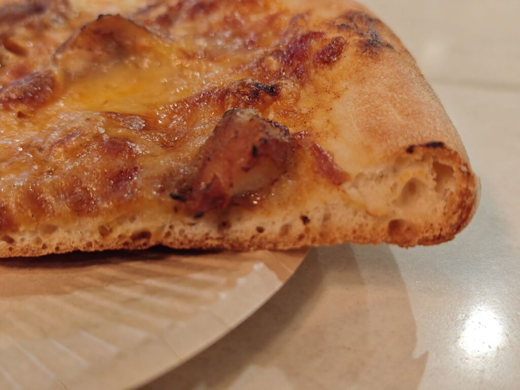 生地は耳の部分含めて全体的に薄め。バリッとしたクリスピーな食感で程よい固さがあるので指で持って食べやすいです。特に焦げや焼きムラもなく綺麗に均一に焼けている印象。