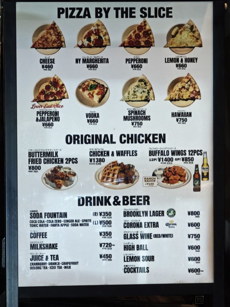 ピザは「ホールサイズ」と一切れずつの「スライス」あり。会計は先払い制。
