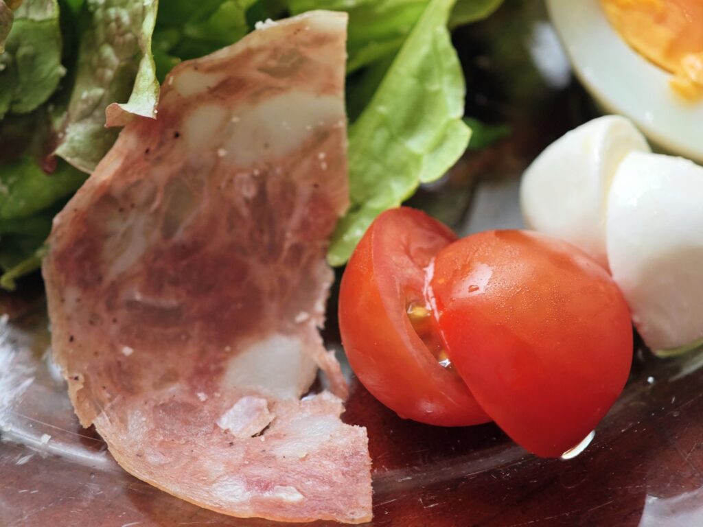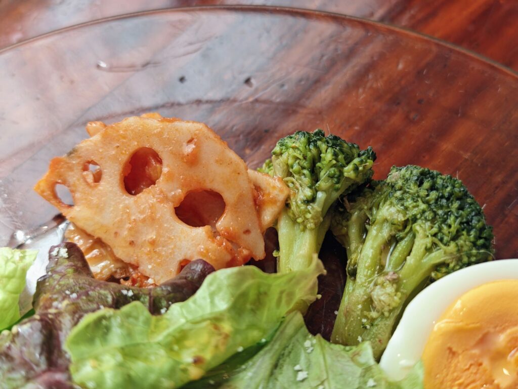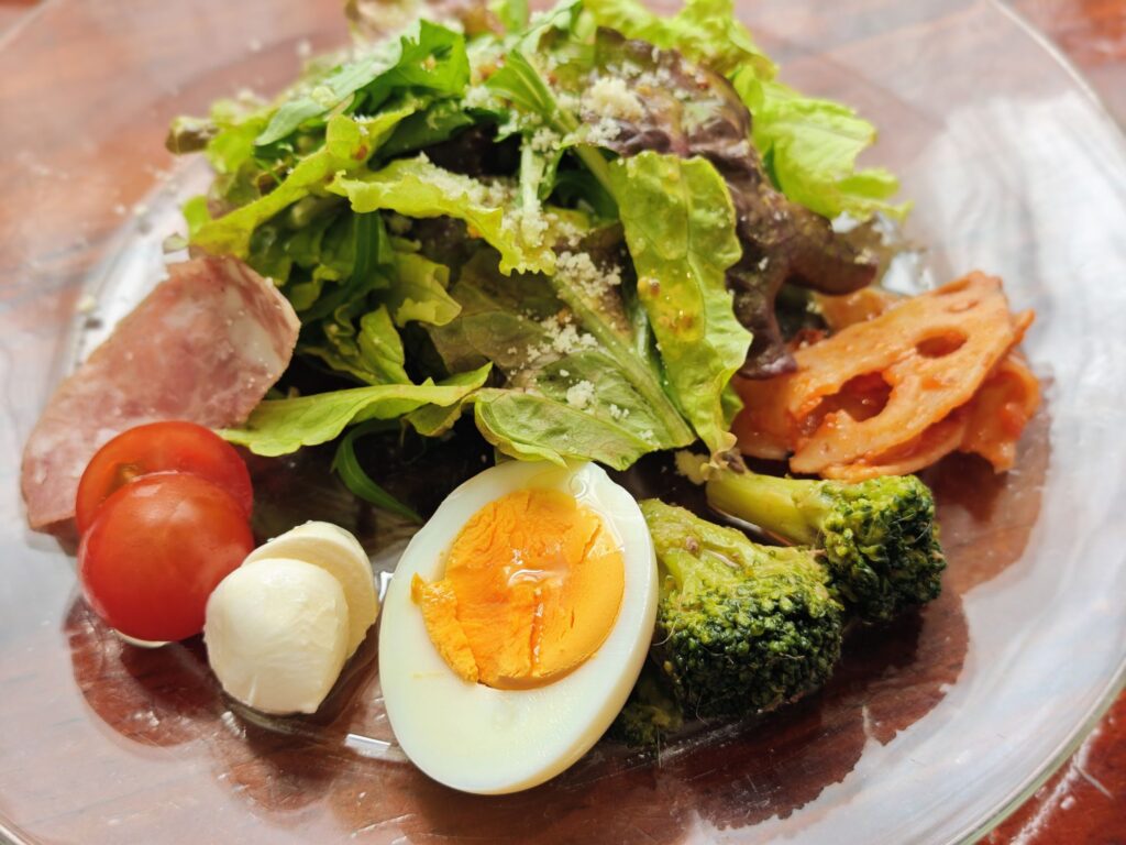 レタス、ブロッコリーのオリーブオイル和え、モッツァレラチーズ、ゆで卵、ミニトマト、生ハム、レンコンのラタトゥイユ。ここまで多品目とは良い意味で裏切られました。盛り付けも綺麗ですしメチャ豪華ですね。