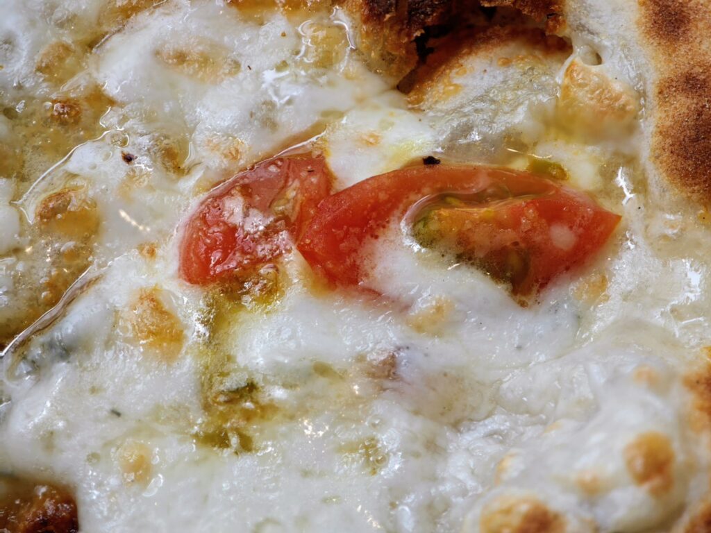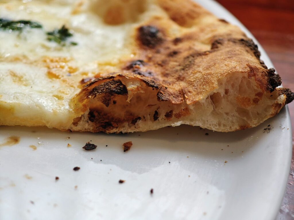 犬歯を立ててピッツァを噛みこむとコルニチョーネの部分はさっくりとした歯ざわり。グルテン化した小麦粉のコシやモチモチ感はあまりなく、比較的軽やか寄りな食感に仕上げられており優しく歯切れしてくれます。
