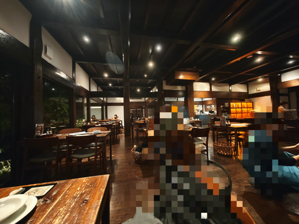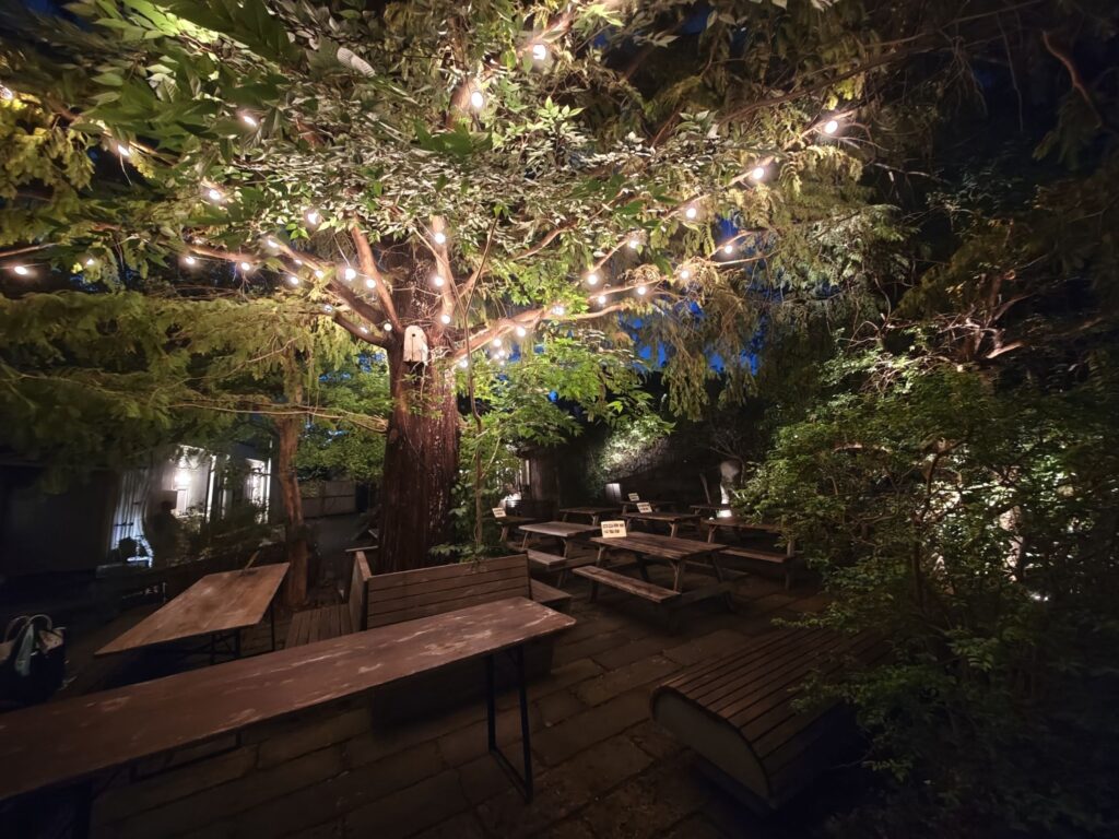 訪問したのはディナータイムですが、都会の喧騒を忘れさせる森の中、ライトアップされた木々の間から店が現れてムーディーであり幻想的。