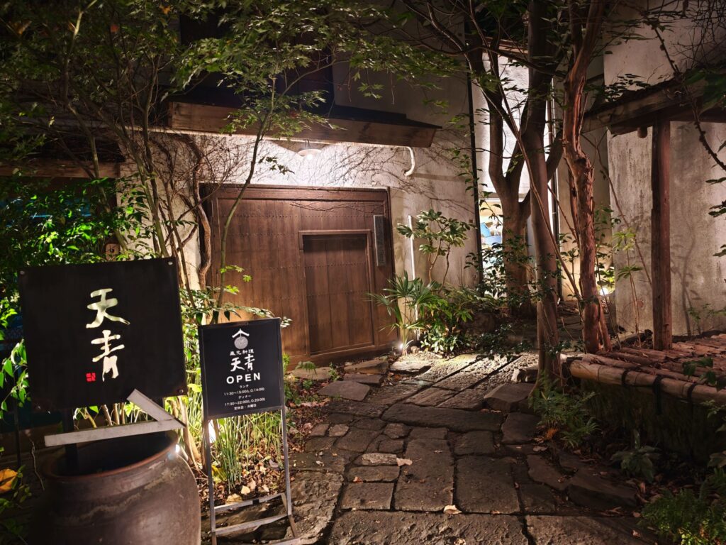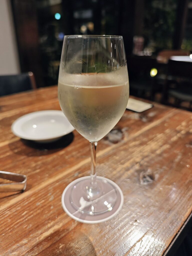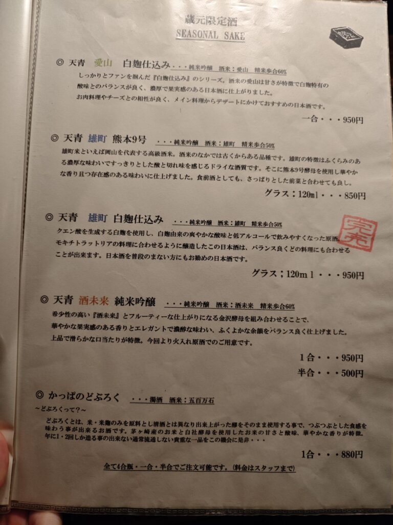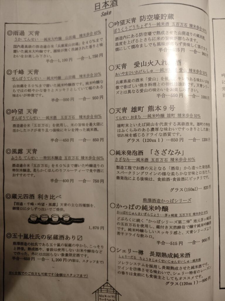 純米酒「吟望 天青」。ほんのり熟成感がありライチを思わせる淡い上品な甘味の中に、ツンとしたほのかな酸味が感じられる。こざっぱりとした軽い口当たりで料理の味を阻害しない味わいでした。
