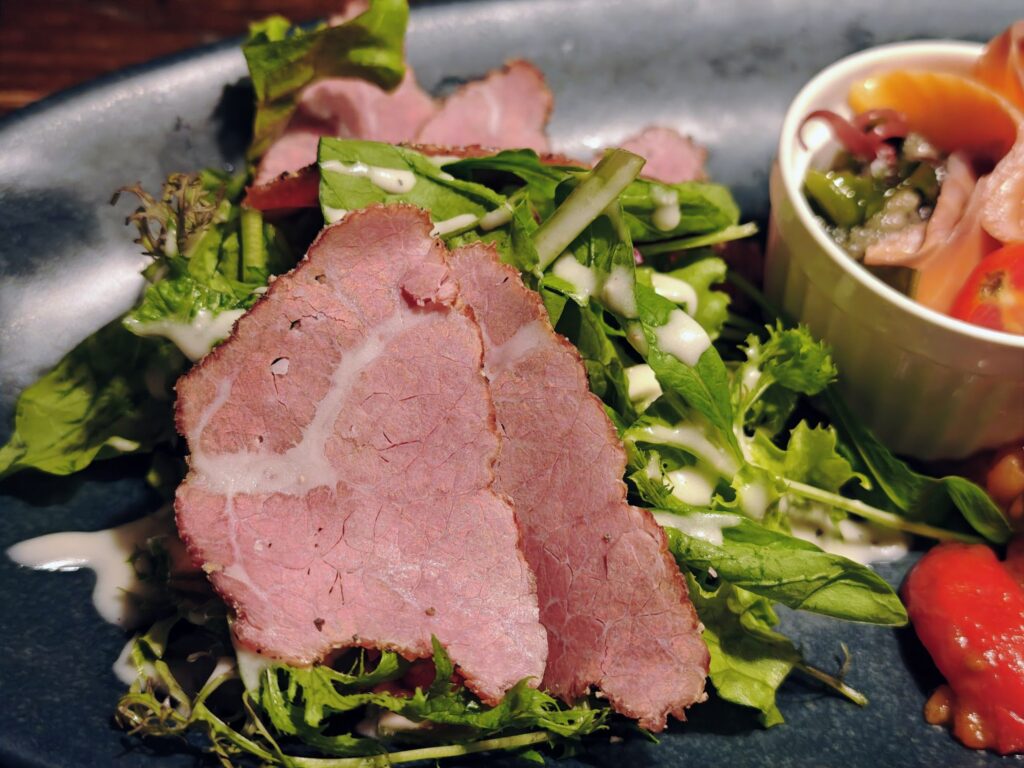 「ローストビーフとシーザーサラダ」。ローストビーフは薄切りですが5枚入り。しっとりとした食感で熱の入れ具合も絶妙です。