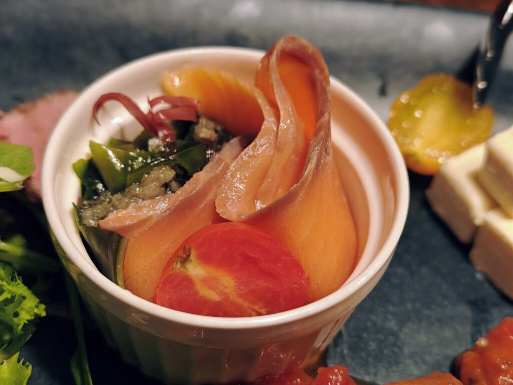 「サーモンのカルパッチョ」。滑らかでシルキーな食感かつ咀嚼すると深みと熟成感のあるサーモンの風味。