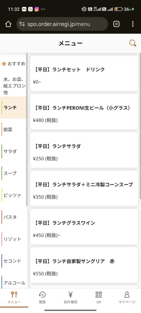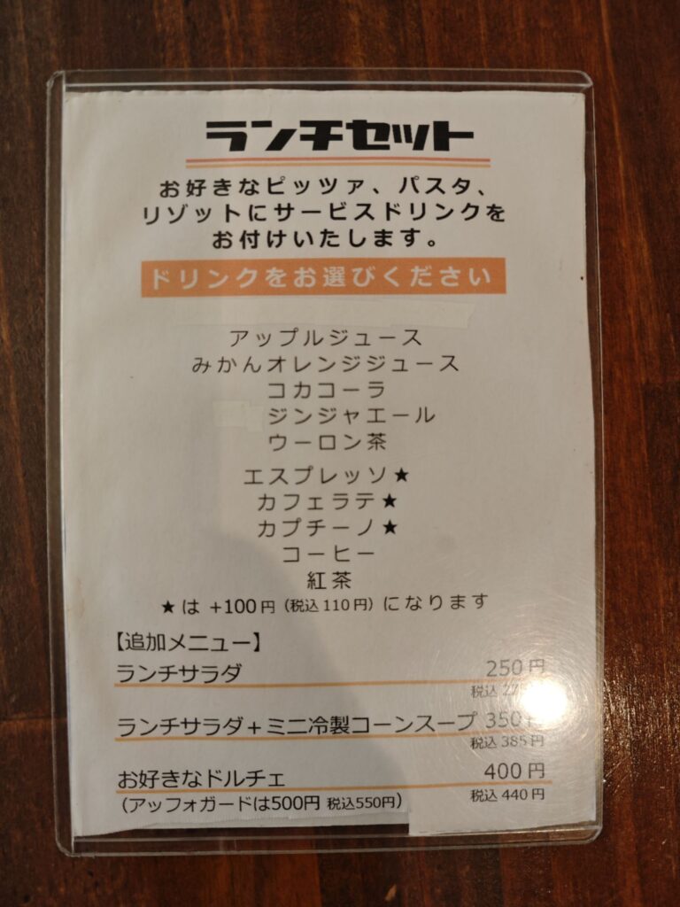 ランチセットはソフトドリンク1杯がセットになっており、さらに追加料金を払うことでサラダや冷製スープ、ドルチェをセットする事ができます。