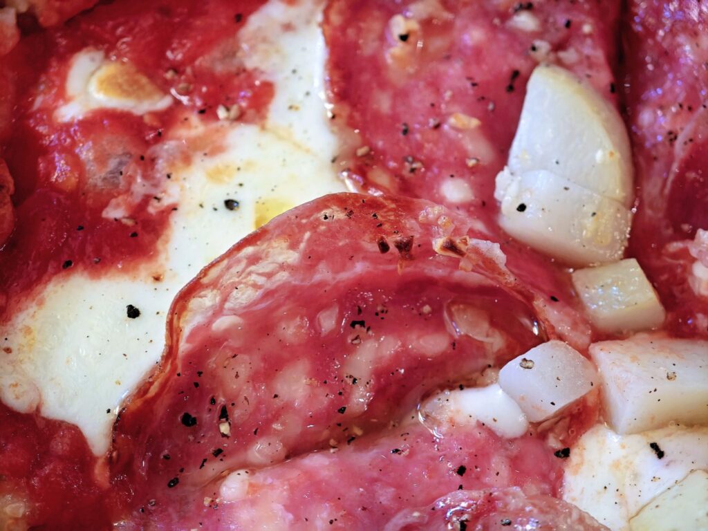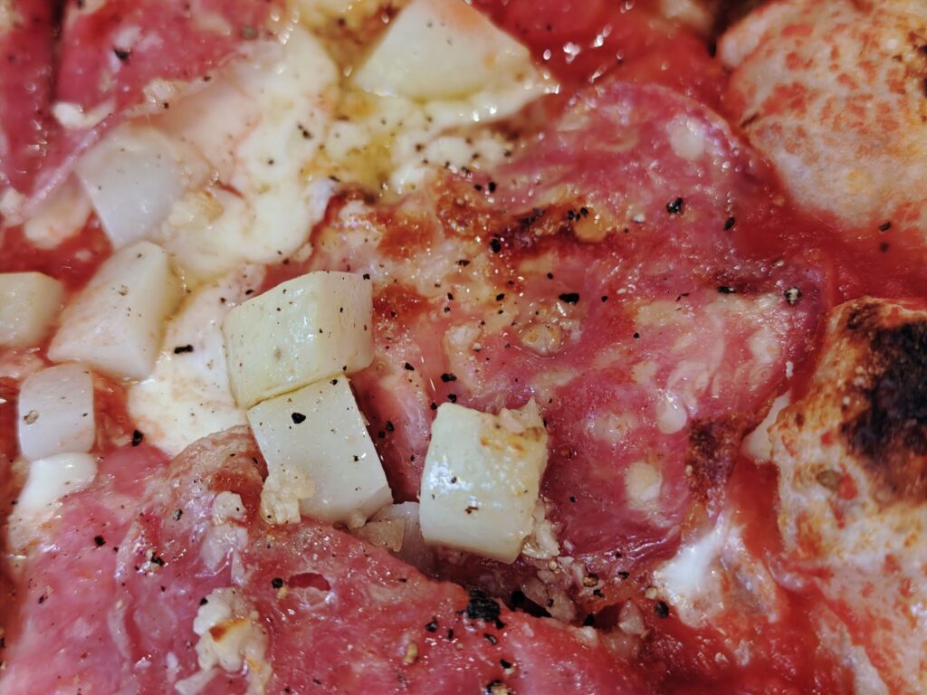 トマトソースをベースとして具はモッツァレラ・サラミ・ジャガイモ・ニンニク・コショウが使われています