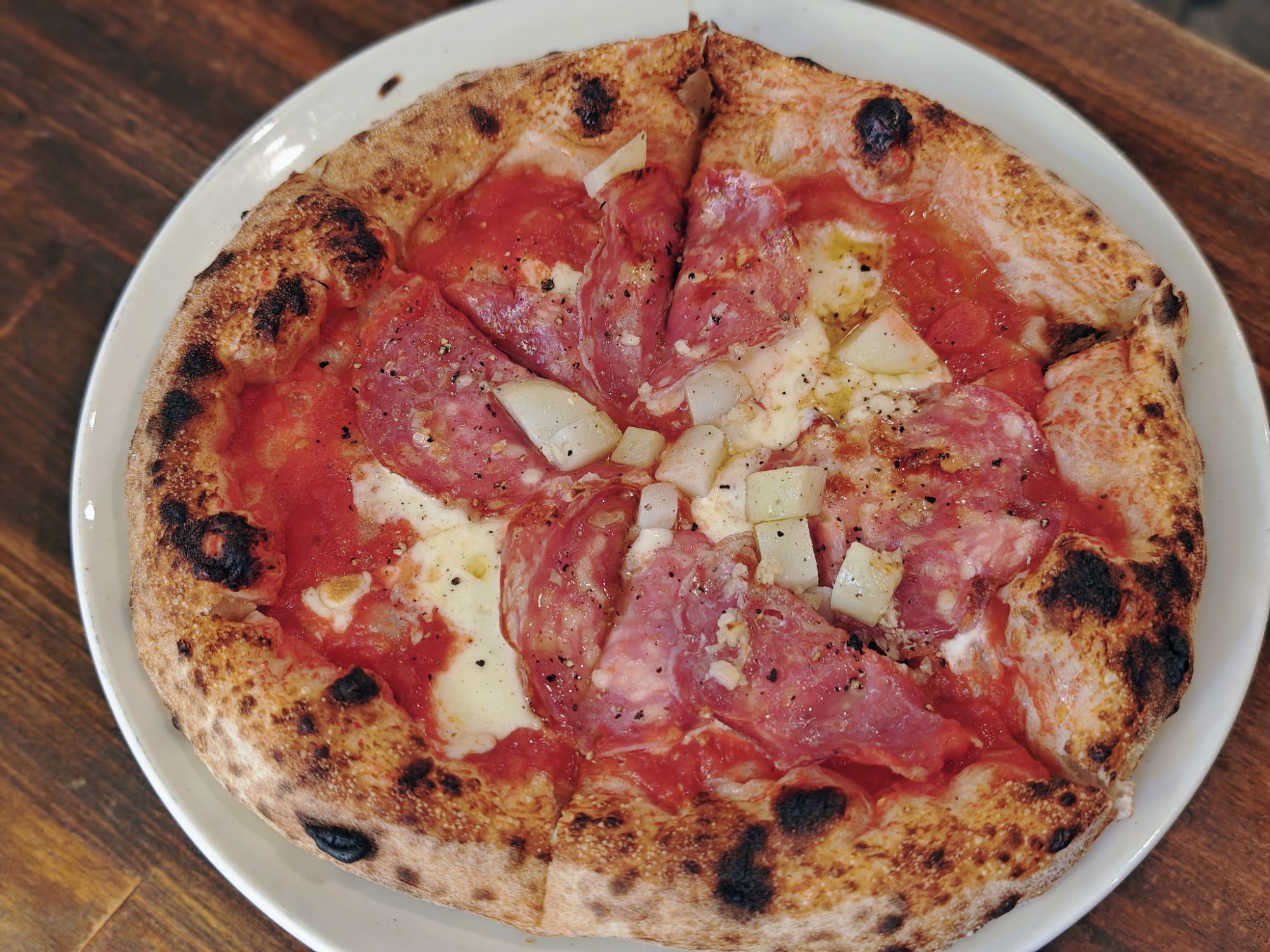 味の構成はトマトソースの甘味酸味に、たっぷりのサラミの辛味と肉のうま味と脂身の甘味、黒コショウのピリリとしたスパイス感の多層的な味わい。