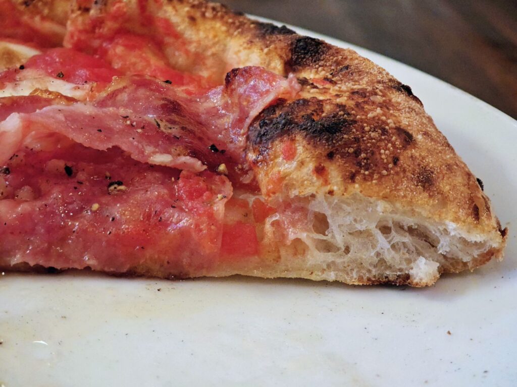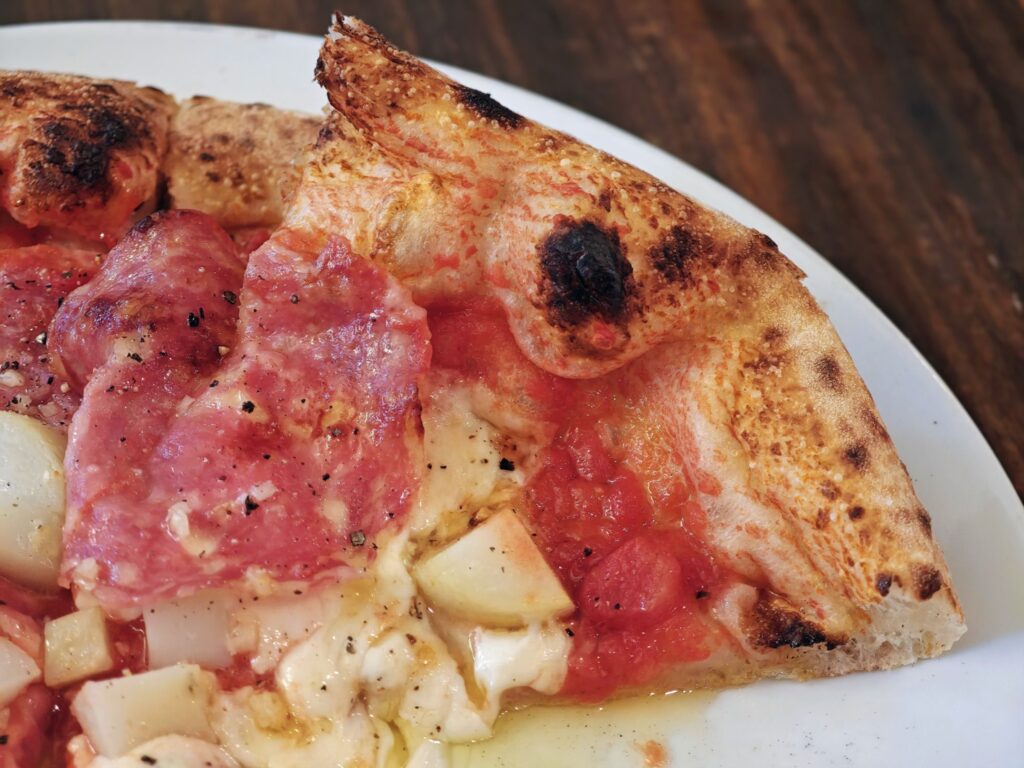 臼歯で噛みこむとモチモチ感が強く豊かな弾力感とさっくりと軽くてエアリーな食感を兼ね備えており、特に明記はないのですが、ピッツァ・コンテンポラネア(ナポリで近年流行りの今風のピッツァ)に近い雰囲気の生地感です。