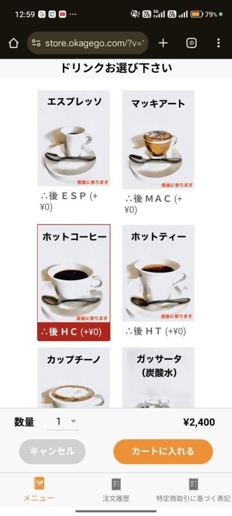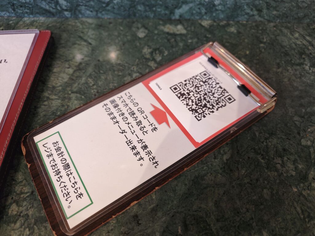 注文は卓上のQRコードをスマートフォンで読み取り専用サイト経由で(口頭での注文も可能と思われます)。