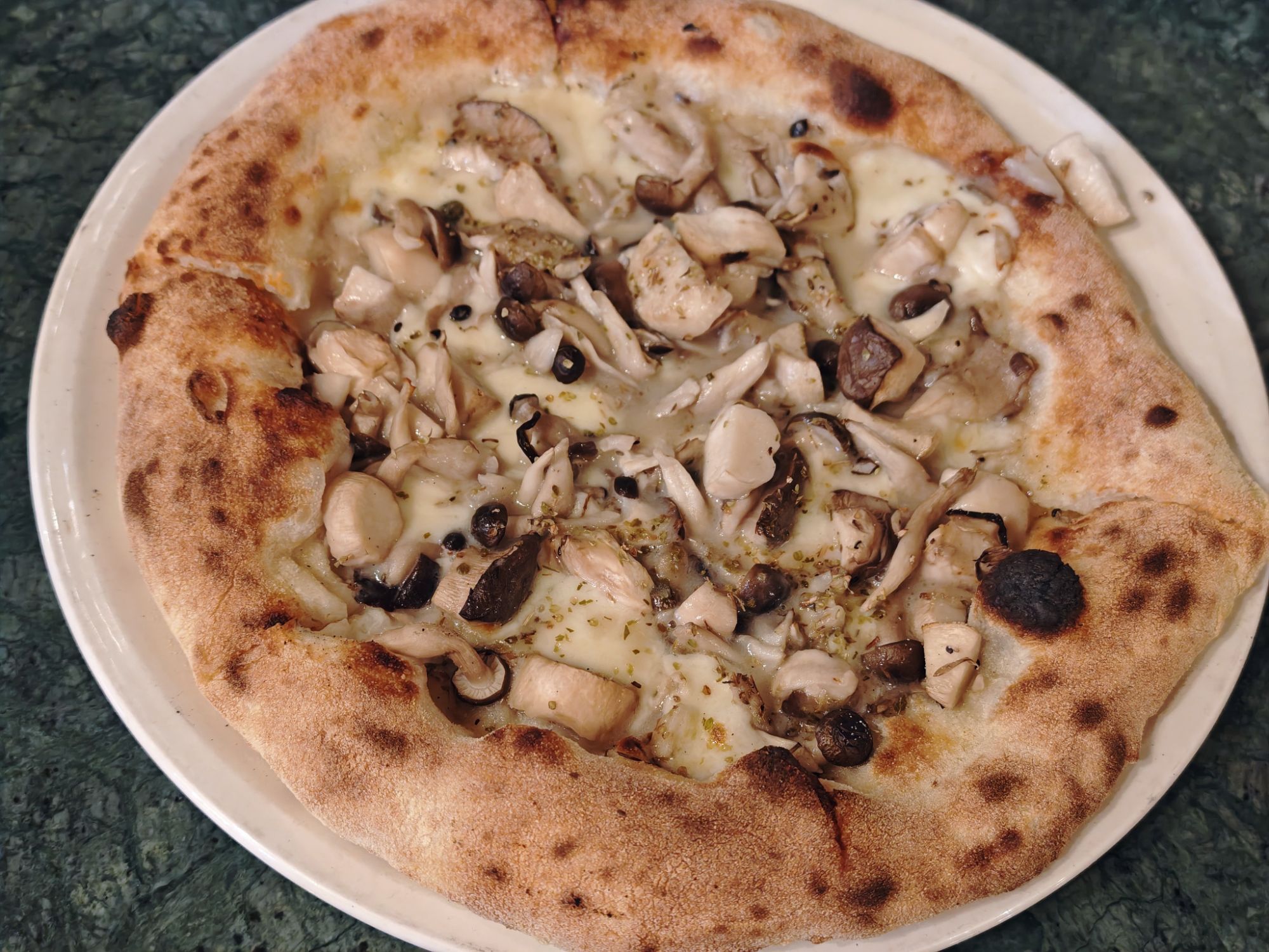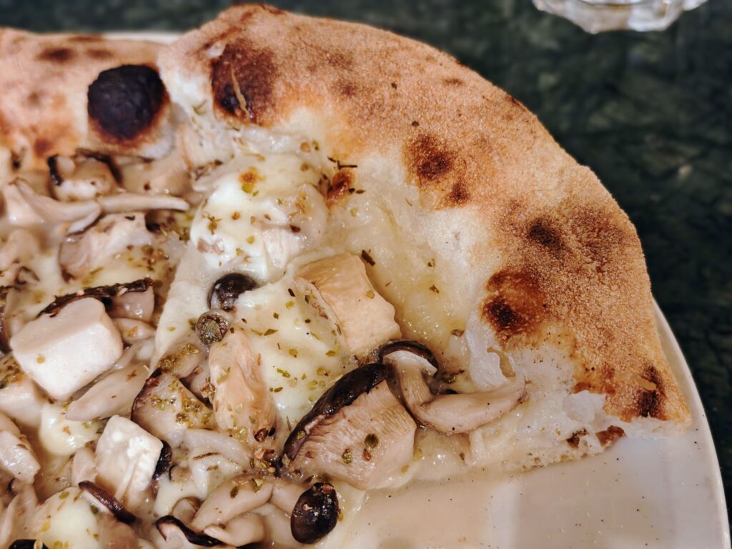 ビアンカ(=白、チーズベース)のピッツァとなっており、モッツァレラチーズにキノコ類、アンチョビソース、オレガノ、ケーパー、パルミジャーノが使われています。