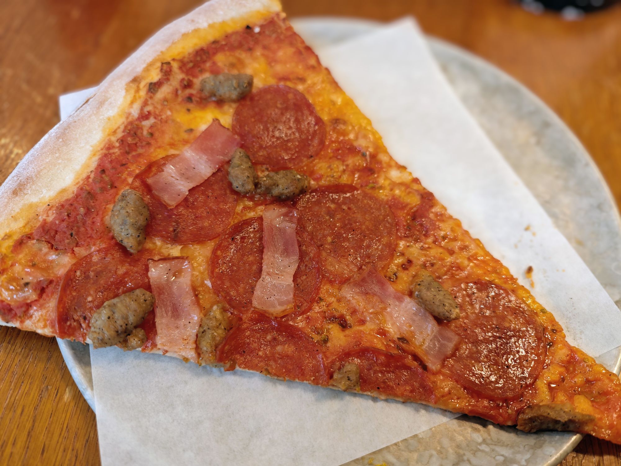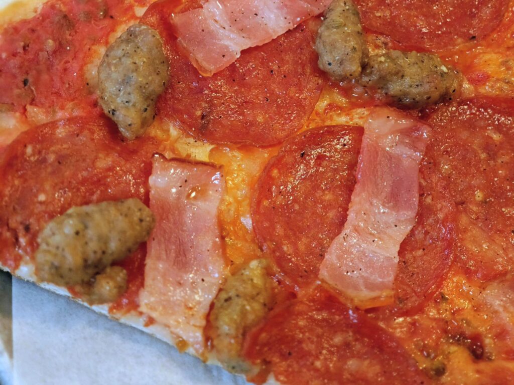 その名の通りベーコン・ペパロニ・イタリアンソーセージの3種が乗った、肉好きならニッコリしそうなピザだ。