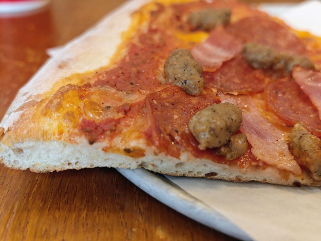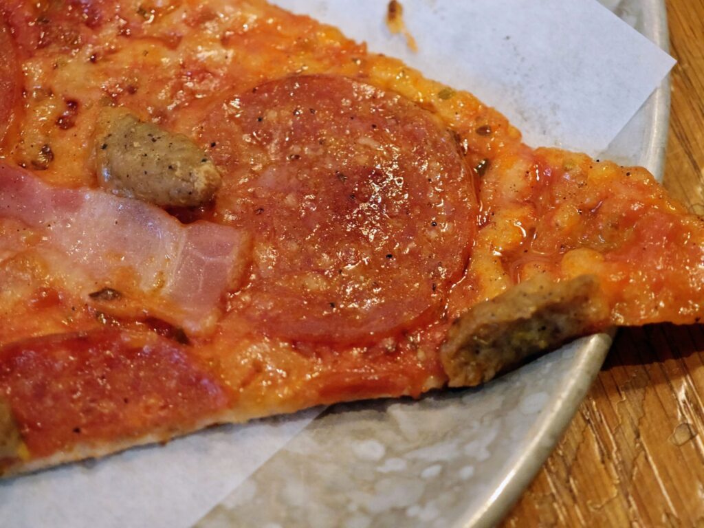 ベーコンの塩気とスモーキーさ、ペパロニの辛味、イタリアンソーセージの脂の甘味と三者三様の肉の美味しさを楽しむ。まさに「Jesus!」と叫びたくなるどこか背徳感がある満足度でした。