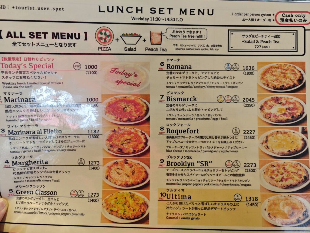 ピッツァは王道のマリナーラやマルゲリータはじめ10種類から選ぶ事ができます(ピッツァごとに値段は変動)。