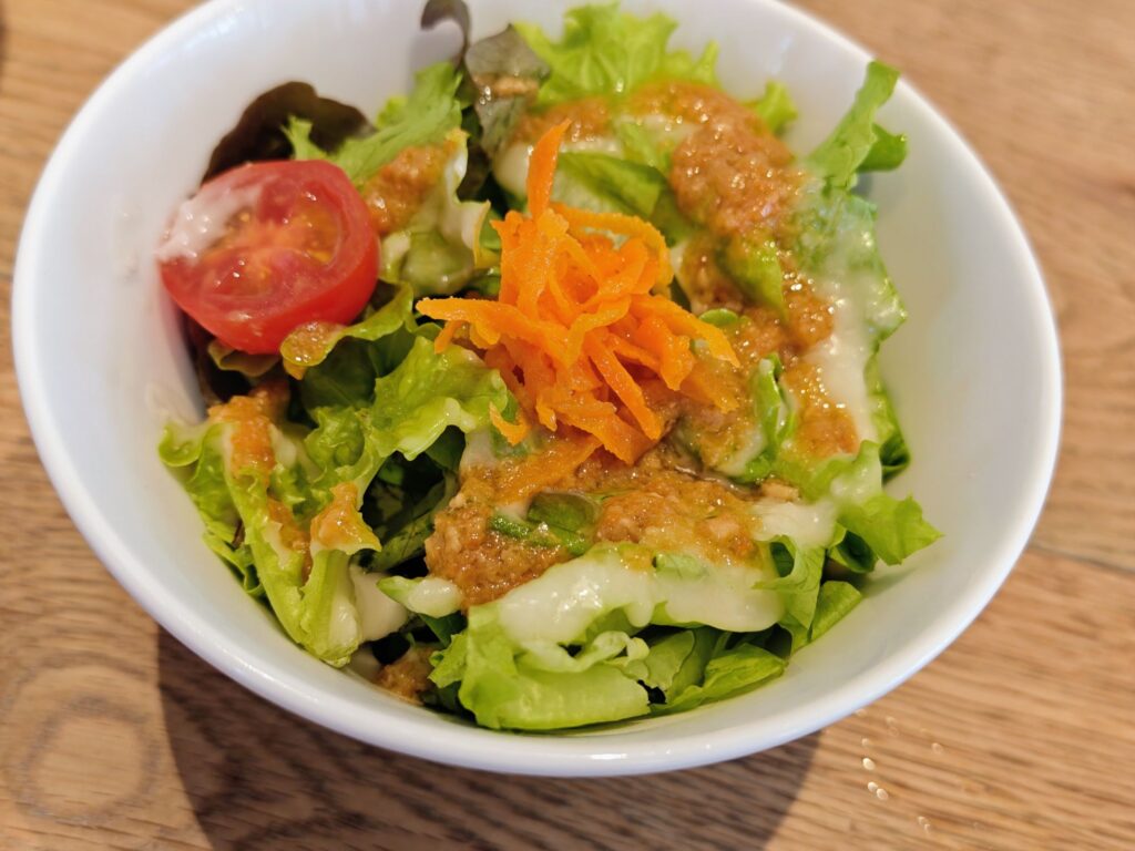 レタス、人参、ミニトマトをさっぱりとしたドレッシングで和えたサラダ。カップ状の器に入って提供されます。
