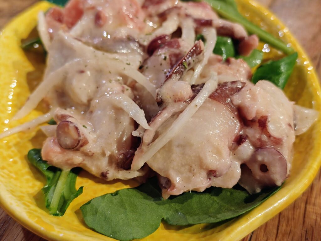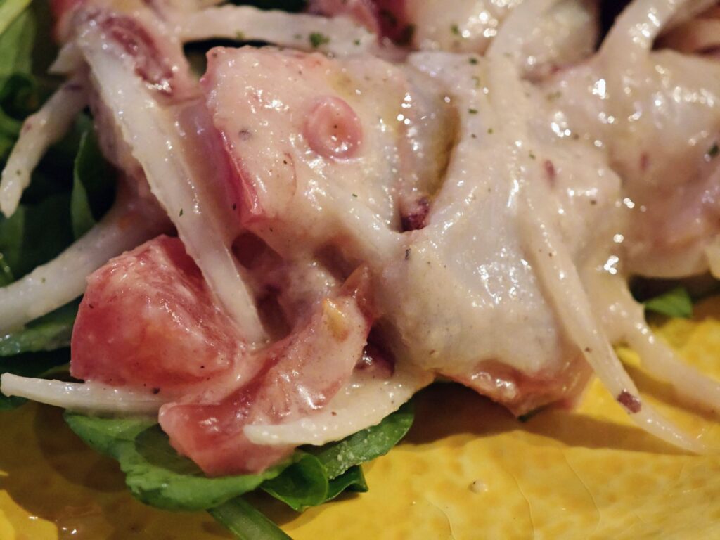 酸味感のある爽やかなソースと玉ねぎの辛味成分を組み合わせた味付けでさっぱりとして美味。