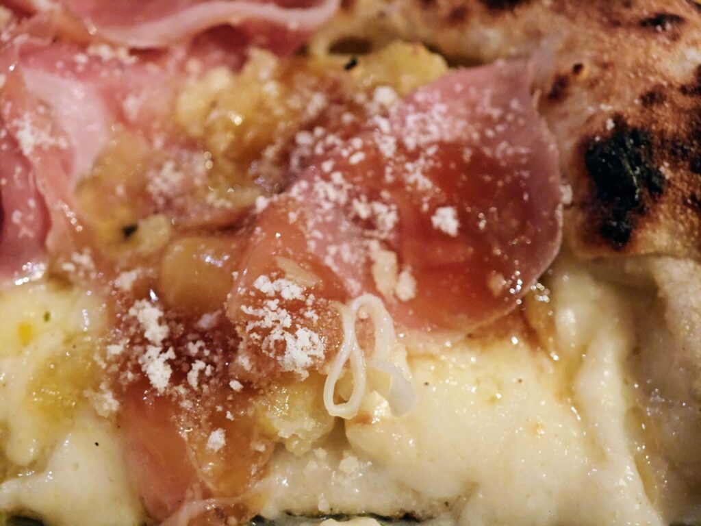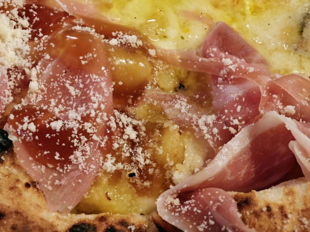 どこかパンプキンケーキを思わせるカボチャの甘さもあり半分フルーツピザのようだ、ゴルゴンゾーラ特有のクセ感が妙に中毒になる。ここにハチミツをかけるとこちらも「甘じょっぱ系」の味に変化する。