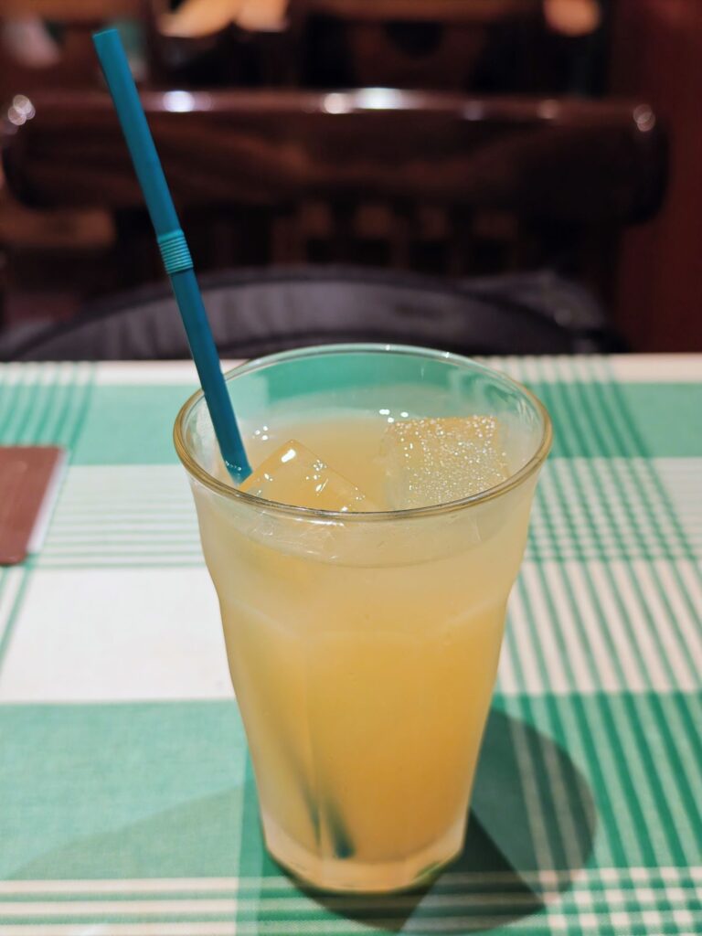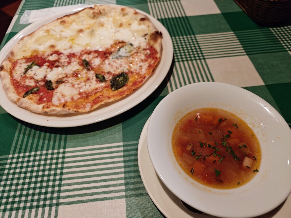 ピッツァセットはメインのピッツァのほかサラダ or スープ、ソフトドリンクが付いてきます。ドリンクは「りんごジュース」をチョイスしました。