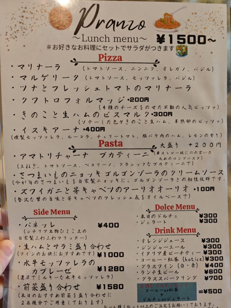 ランチセットは1500円でセットのサラダに任意のピッツァ or パスタを選べる。(「クアトロフォルマッジ」や「ビスマルク」など一部のピッツァは追加料金を支払う事で注文可能)。