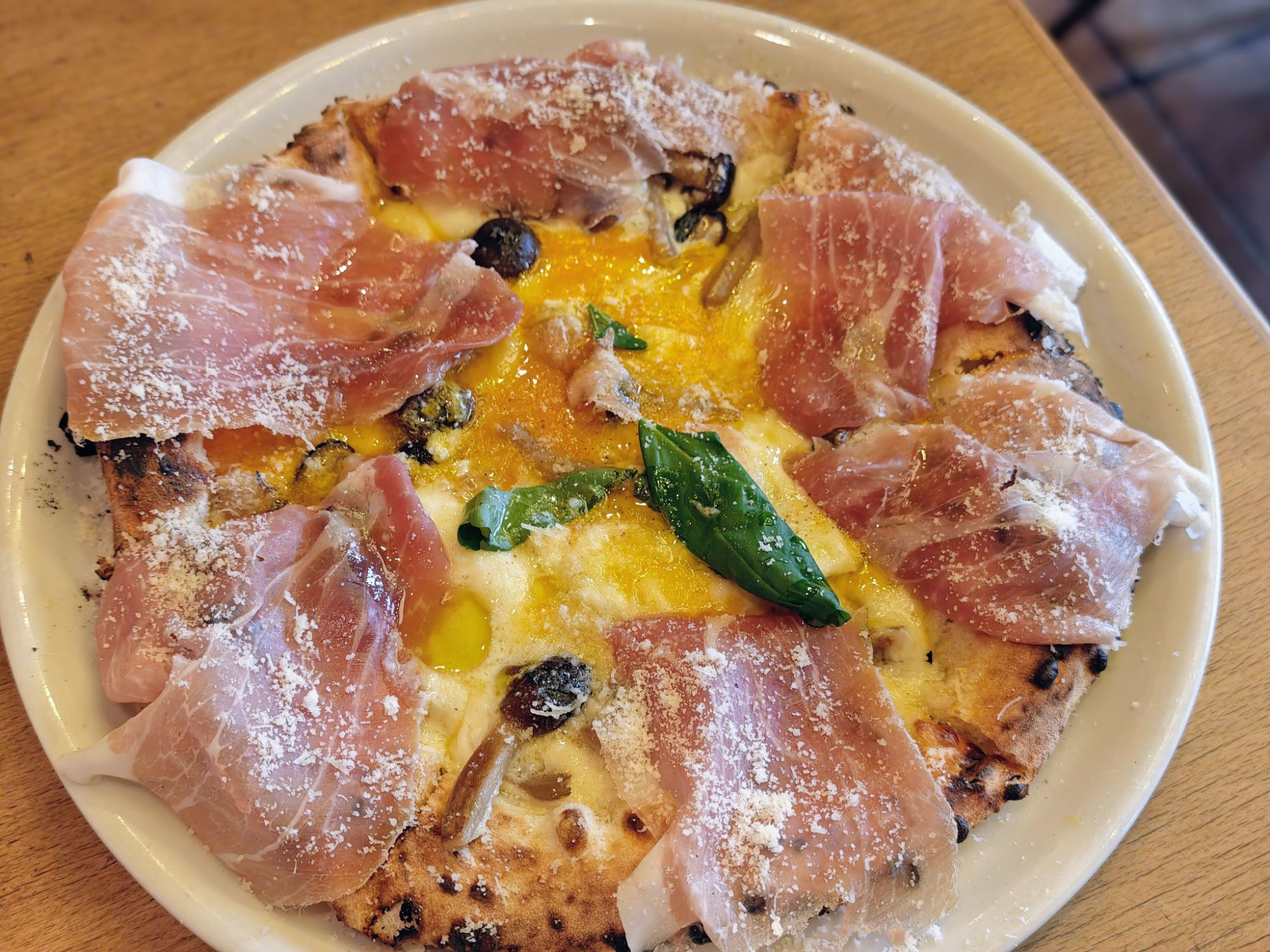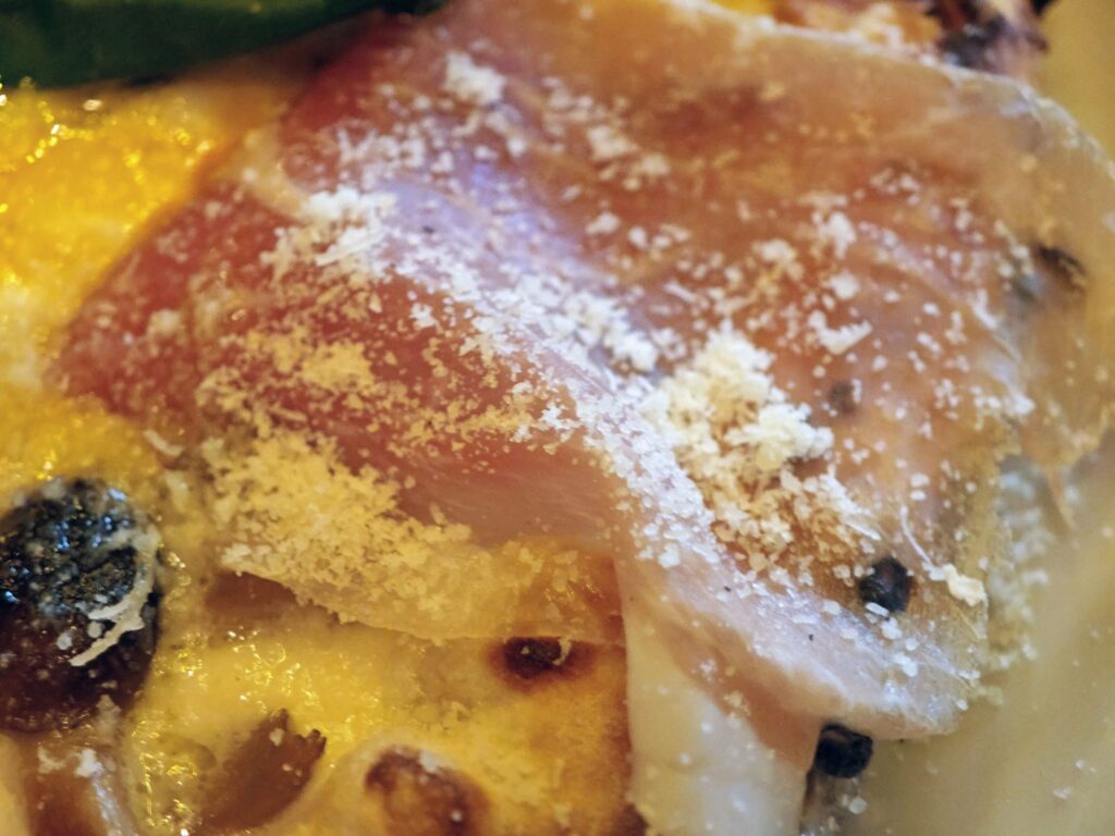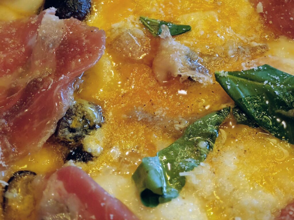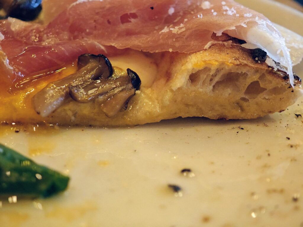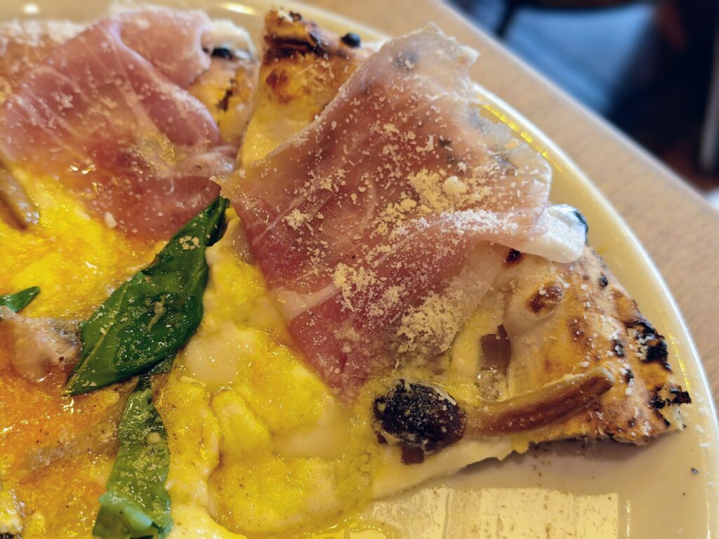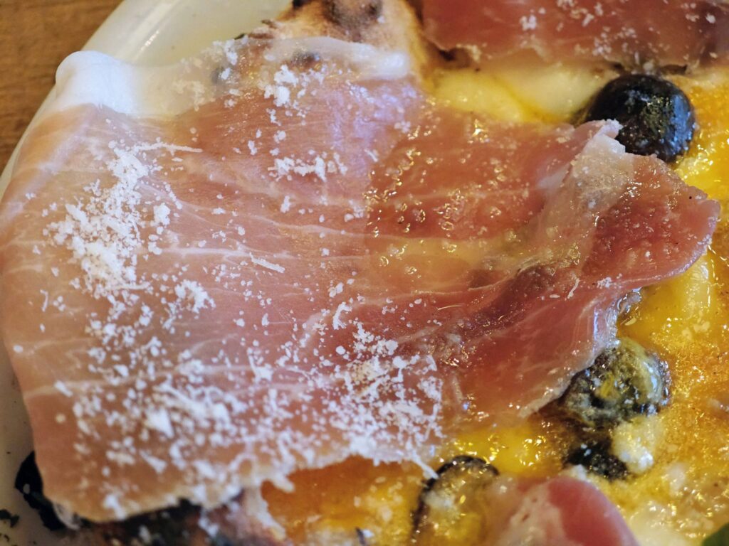 太っ腹にも折り畳まれてピッツァに乗っけた6枚の生ハムが大きく中々にインパクトがあります。これならワインを片手に複数人でシェアし合うのも良さそうです。
