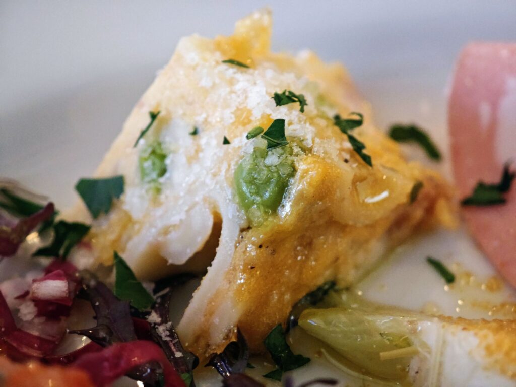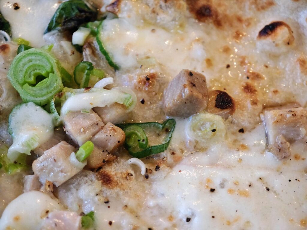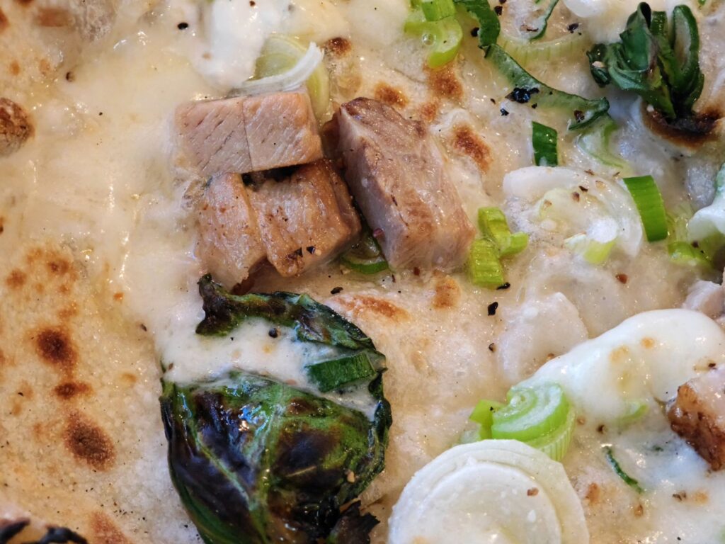 モッツァレラとプローヴォラの2種のチーズを軸として黒胡椒・豚バラのコンフィ・葉玉ねぎといった具材が散りばめられている。