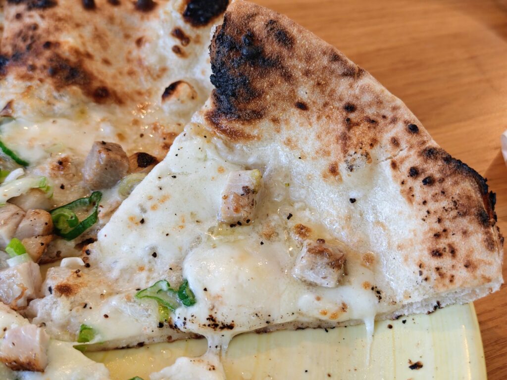 燻製チーズであるプローヴォラが入っているためか、モッツァレラオンリーのピッツァに比べるとチーズが溶け切っておらず少し固め。その分、鼻孔をくすぐる薫香感あるスモーキーな風味があるのが特徴的だ。小さな賽の目状にカットされた豚バラのコンフィはしっとりとしており豚肉の風味主体の滋味深い味わい。