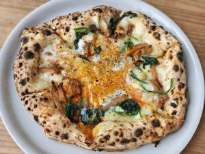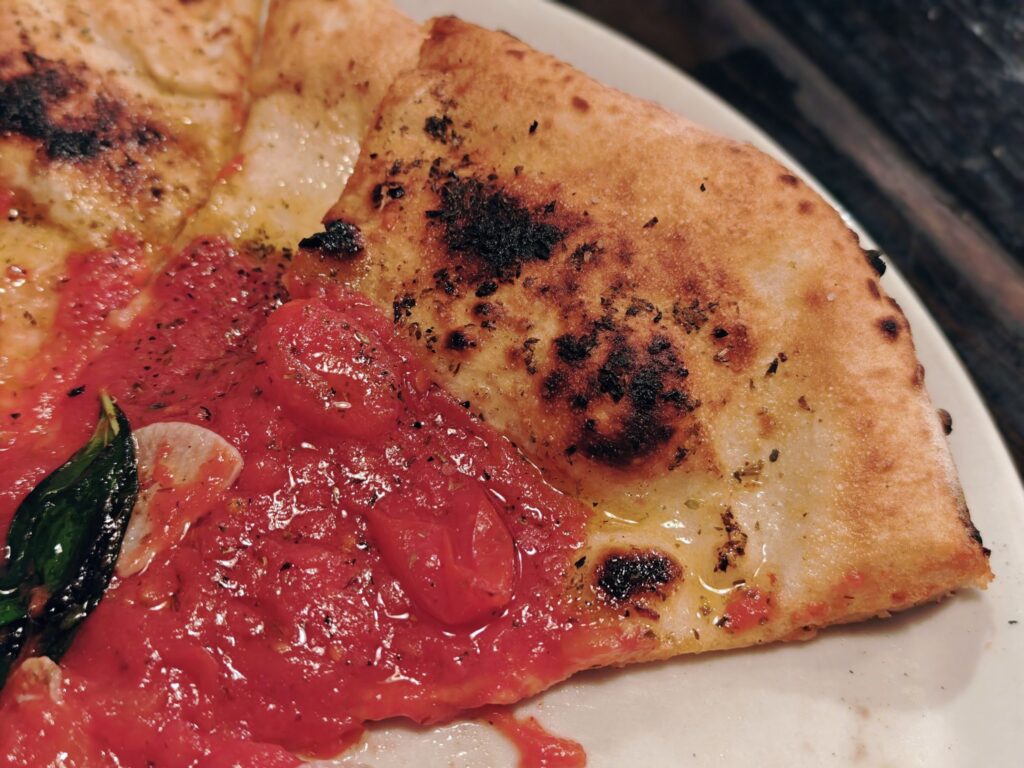 大きく幅広に作られたコルニチョーネ(縁)は噛むともっちりとした強い弾力感を感じさせる。この店出身の御嶽山『ファッブリカ1090』同様、生地の中にキリッとした塩気が感じられるタイプのピッツァなので好き嫌いは分かれやすいかもしれない(著者は好きなのだが)。