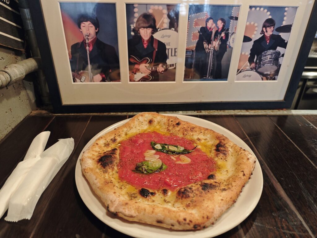 ビートルズのメンバーを眺めながらマリナーラを食す。ピッツァはカットされておらず客が自らフォークとナイフで切るスタイルです。