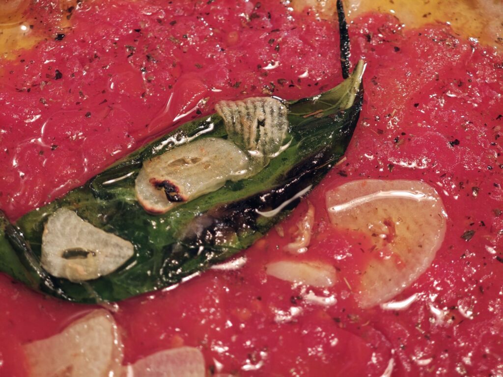 なんといってもトマトが良い。瑞々しくてジューシーなトマトソースはやや甘味勝ちでどこか果物のようなフルーティな口当たり。スライスしたニンニクの辛味との相性もよく大満足。