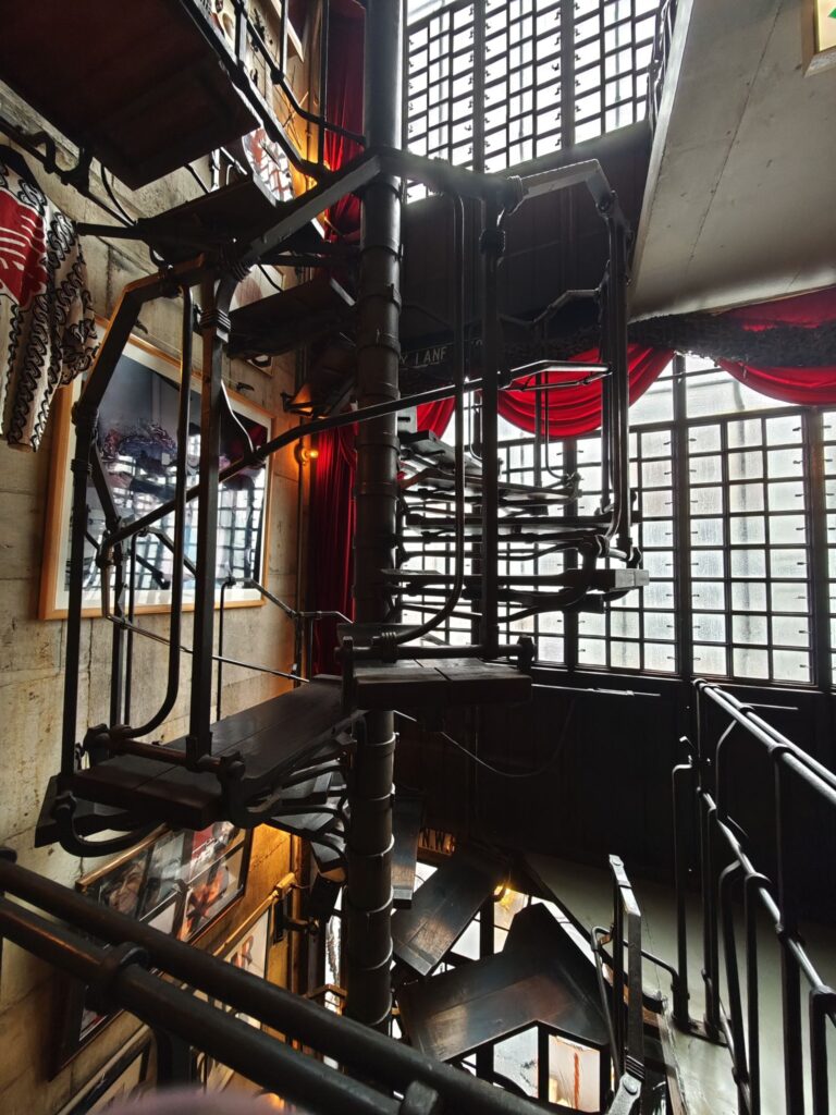 建物の中心を貫く螺旋階段は圧巻のひとこと。ただし足場の天板以外が空洞になっておりスリリングで「ちんさむ」な階段なので昇り降りする際は注意しよう。