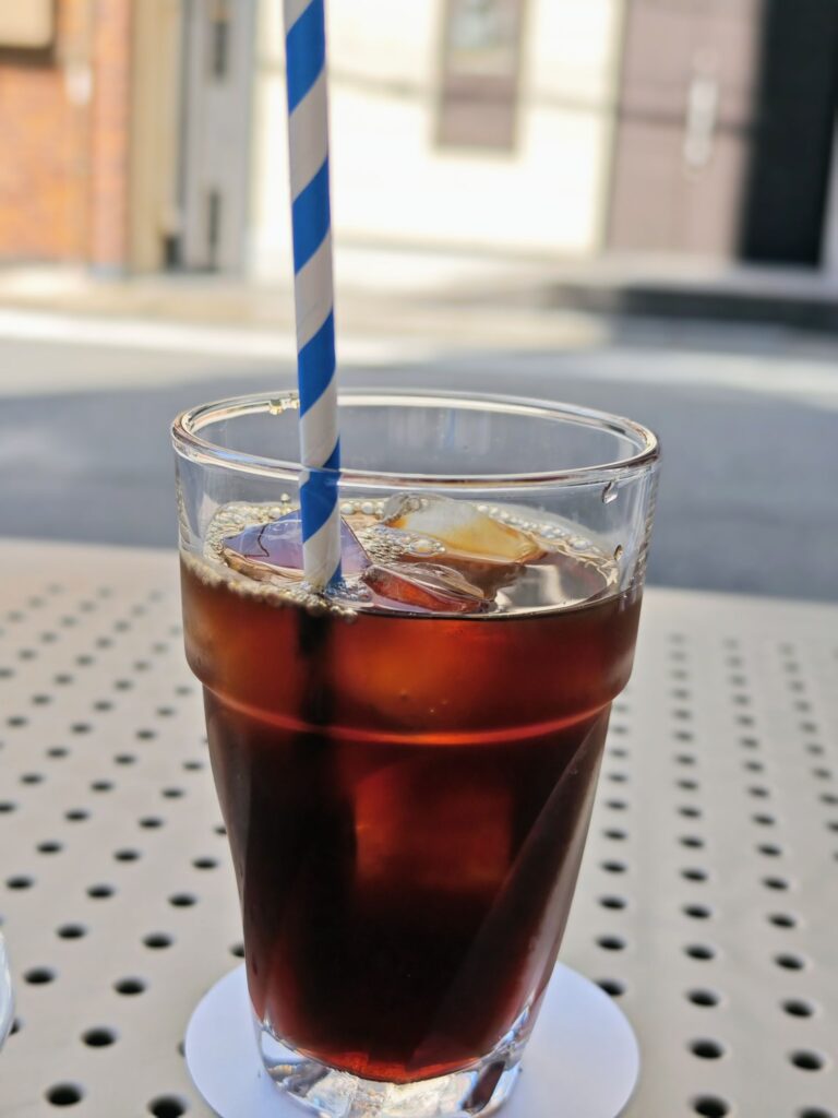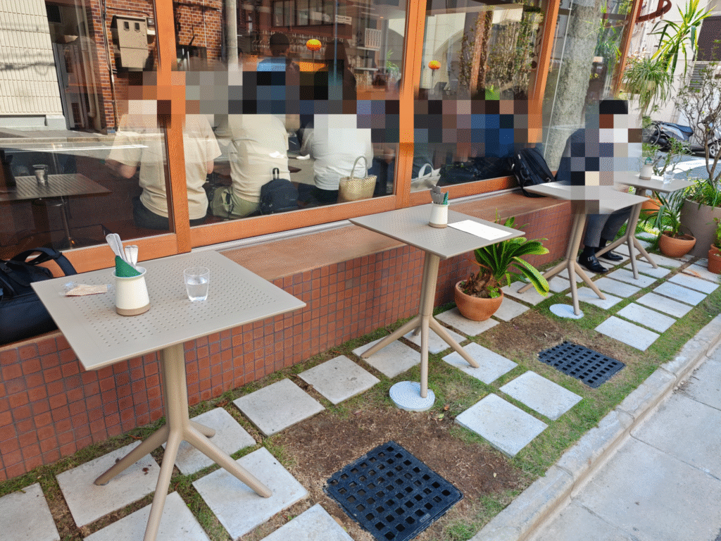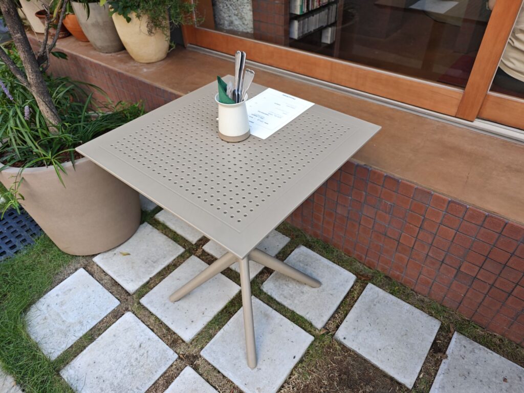 金属製のテーブルとレンガ調の椅子。店の場所は大通りから1本入った所ですぐ裏手が公園なので比較的静かで落ち着いている。