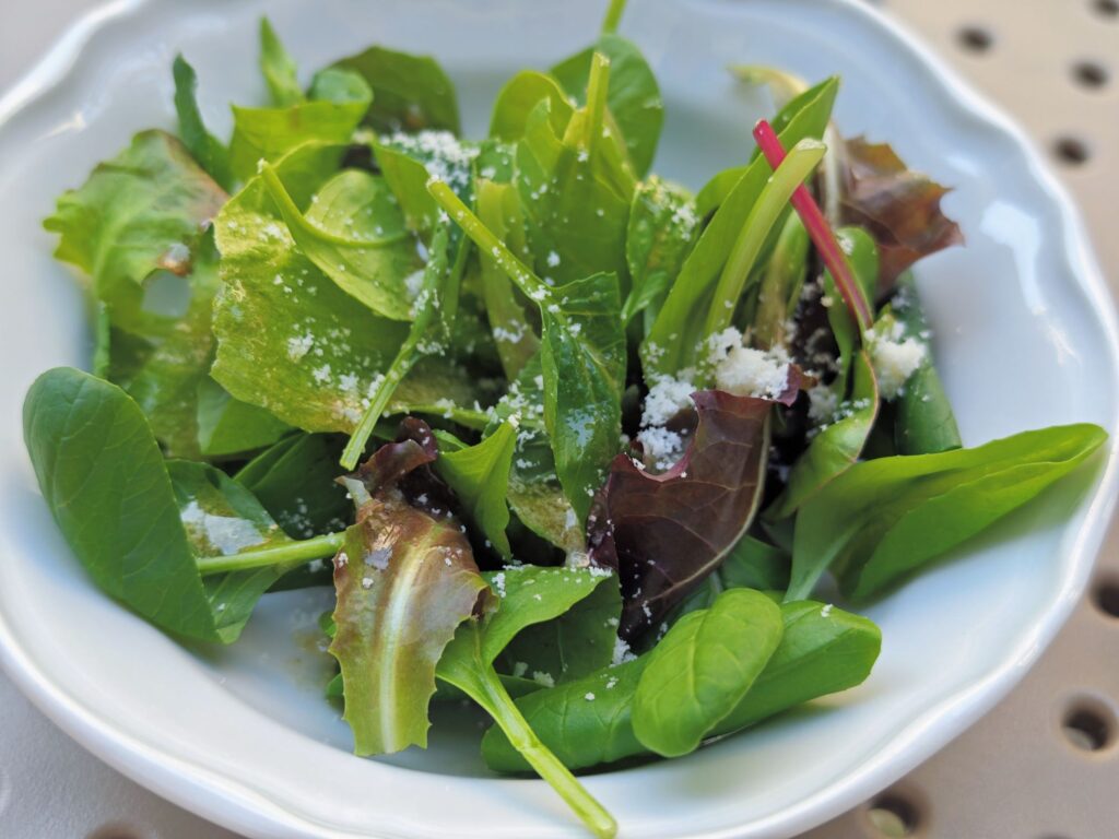 ルッコラに粉チーズ、オリーブオイルをかけたサラダ。