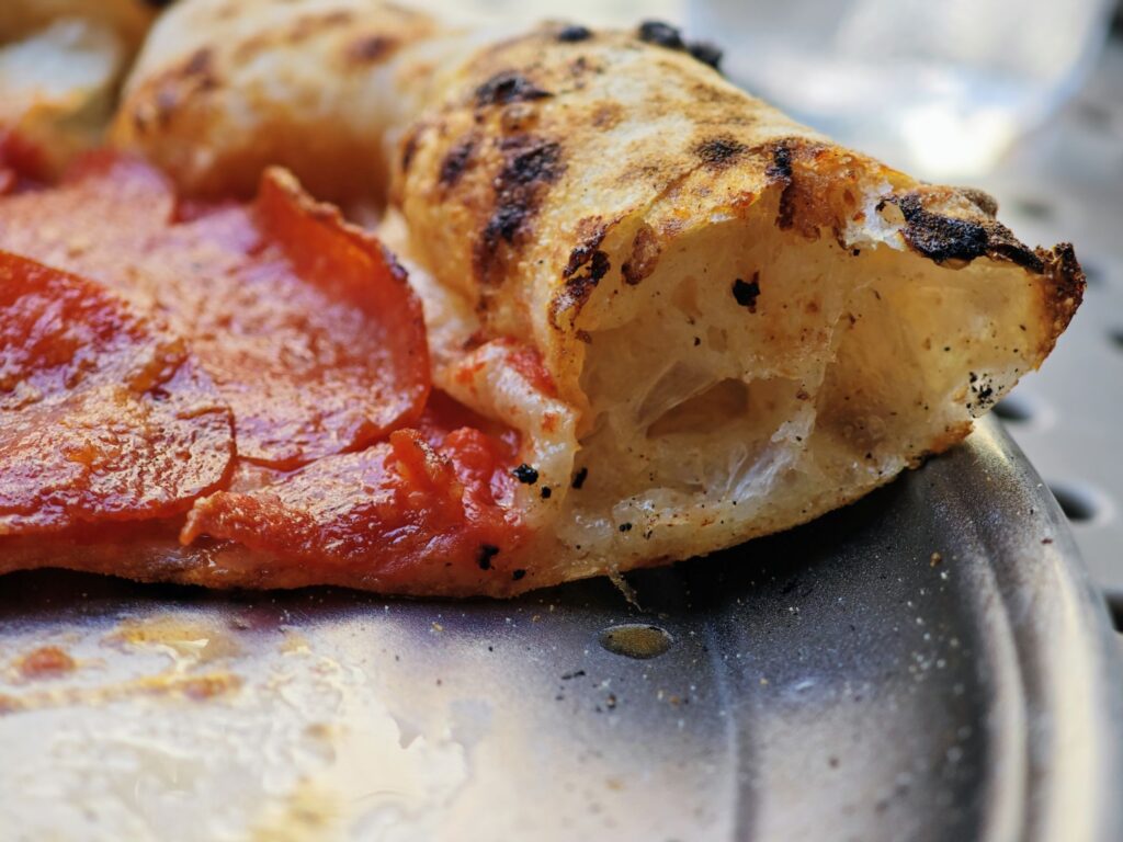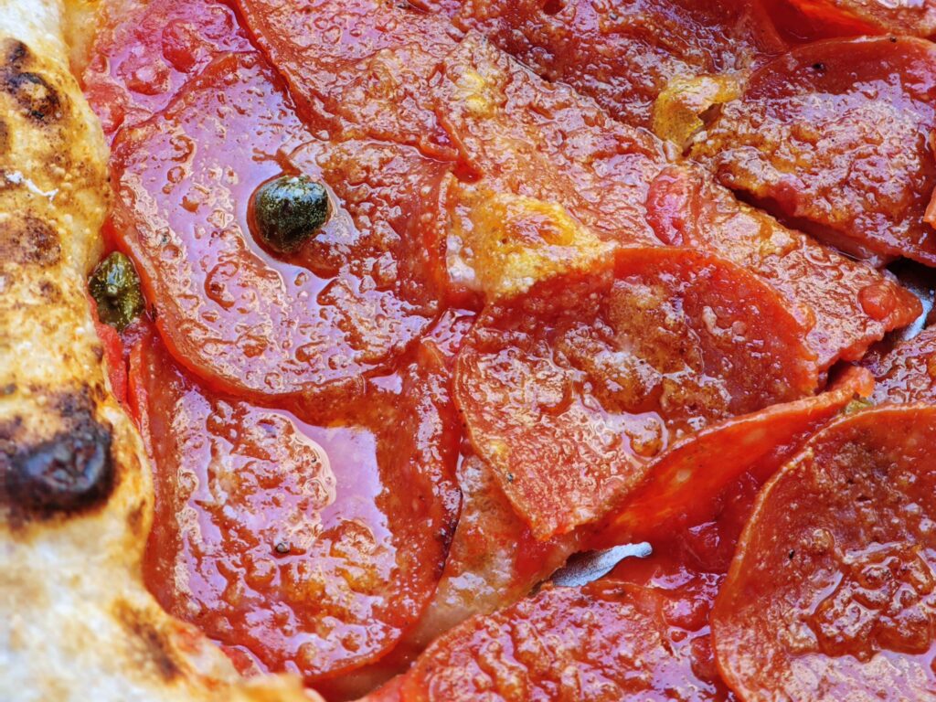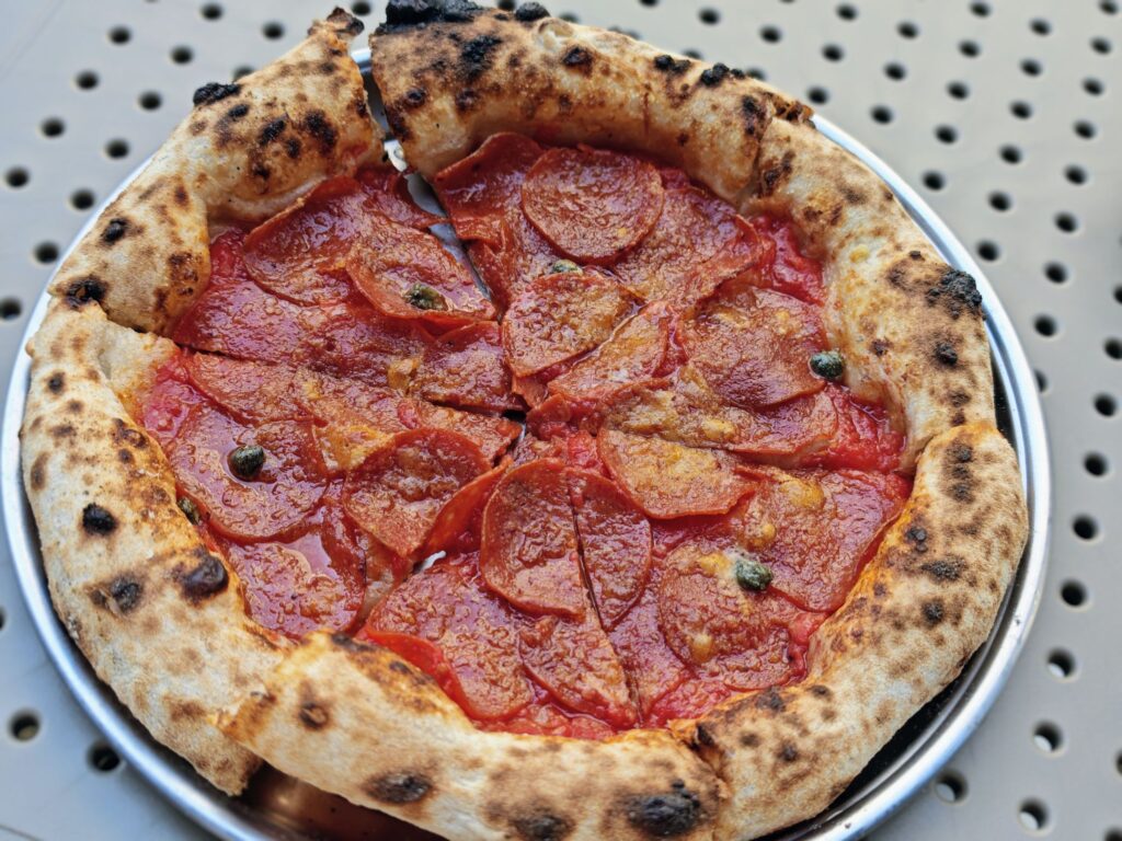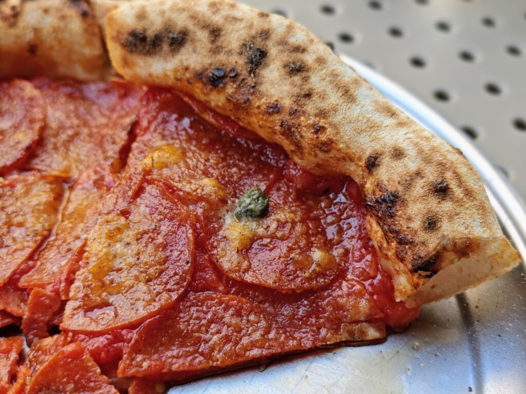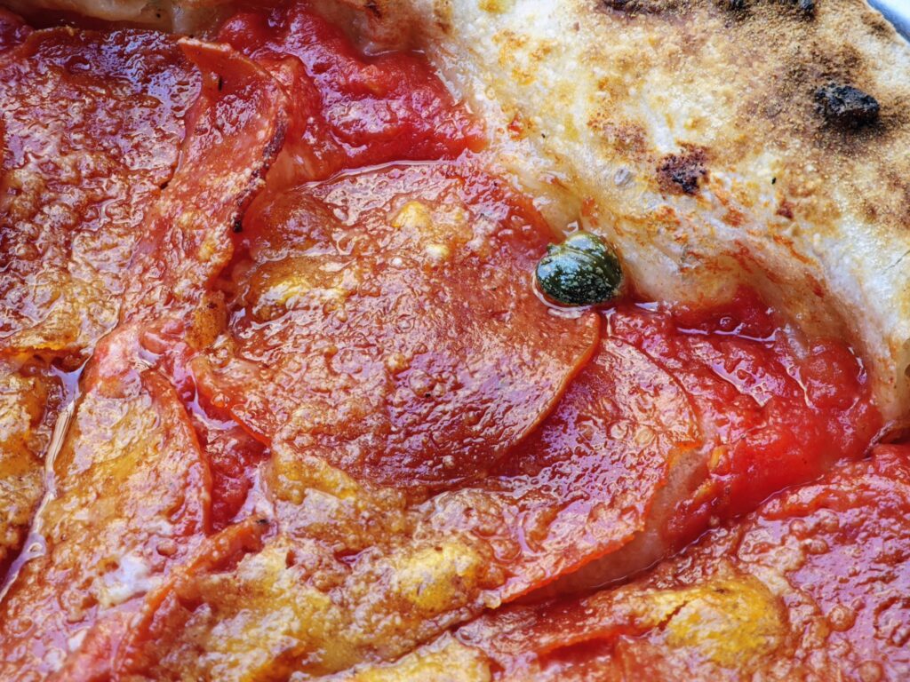 具はトマトソース、ペパロニ、ケイパー、パルメザン。ナポリピッツァ風のコルニチョーネ(縁)のふくらみに、ペパロニたっぷりNYピザを組み合わせたキメラのようなビジュアル。