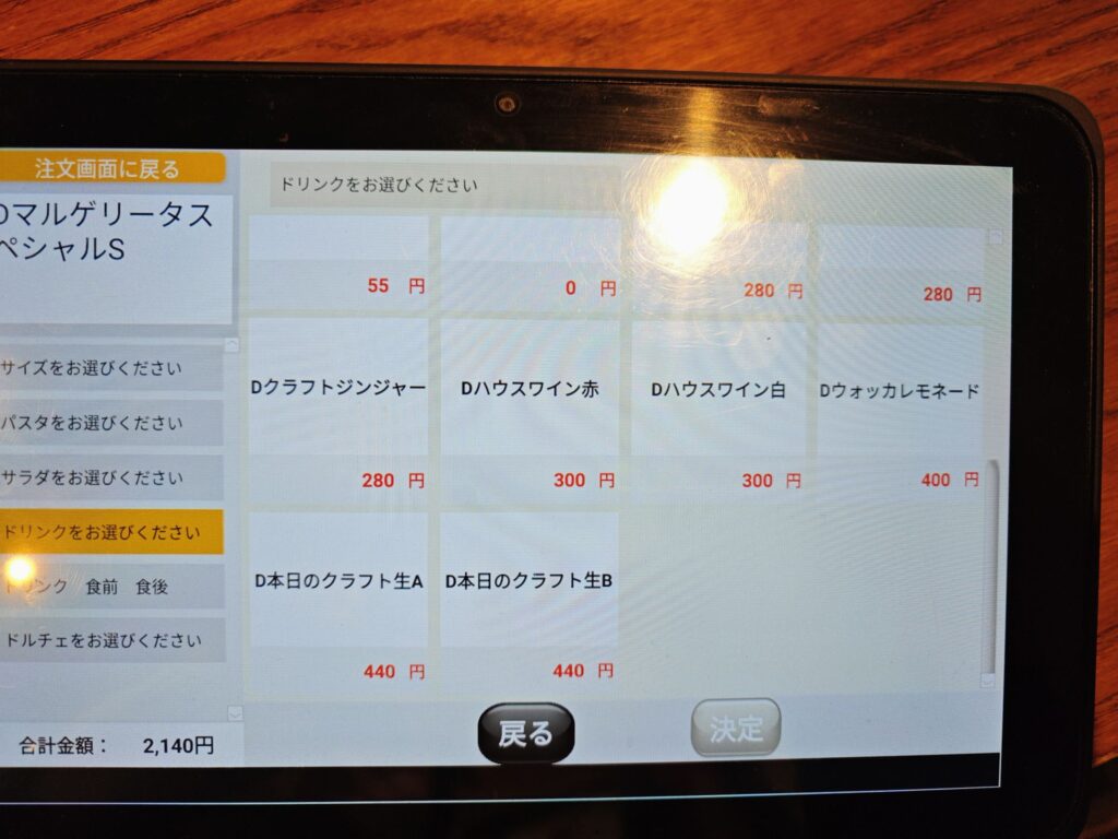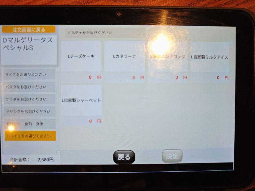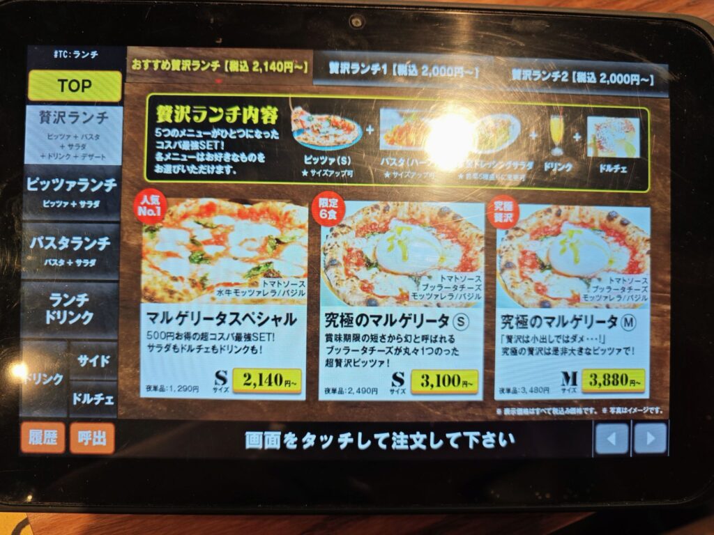 贅沢ランチの場合はデフォルトでピッツァはSサイズ(22cm)となり別料金でサイズアップ可能。