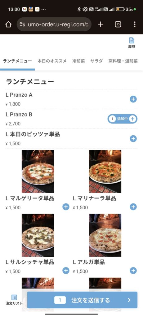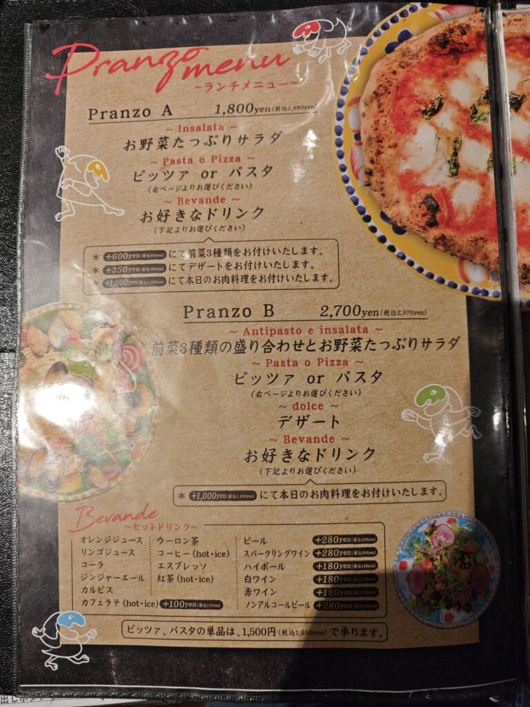 注文方法はモバイルオーダー方式。ランチセットは「PranzoA」と「PranzoB」の二種あり。「PranzoB」はメインのピッツァorパスタ、前菜盛り合わせ、ソフトドリンク、デザートのセット。