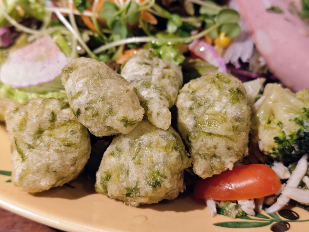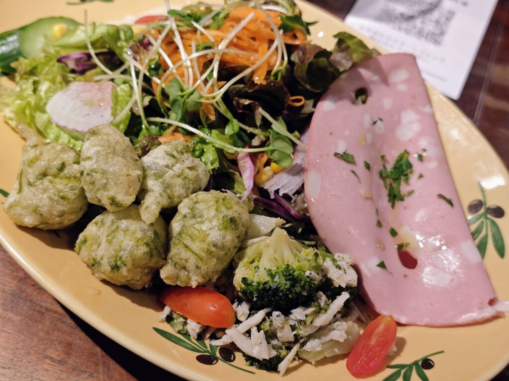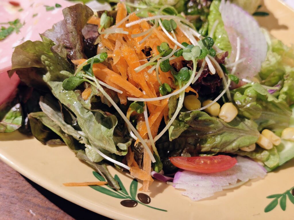 葉物野菜、ニンジン、トマト、カイワレ、コーンなどが入ったサラダもボリューミーでした。