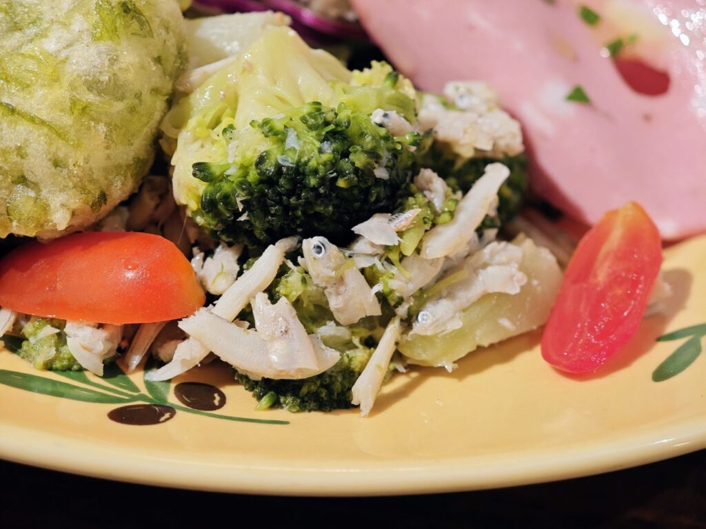 「しらすとブロッコリーのマリネ」。ブロッコリーの素材の味にしらすの塩気をあわせたシンプルな料理。しらすがよく肥えていて風味の豊かさに驚いた。