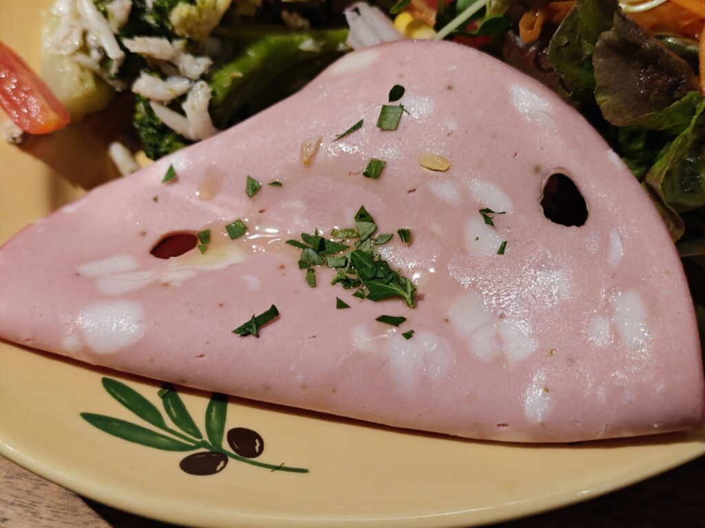 イタリアのボローニャ地方のハム「モルタデッラ」。ピスタチオは入っていないタイプです。