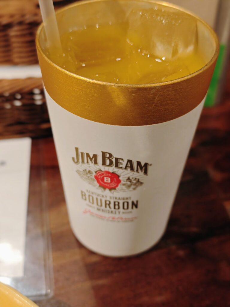 ドリンクは「オレンジジュース」をチョイス。コップがまさかのジムビームのタンブラーなのが驚いた(笑)