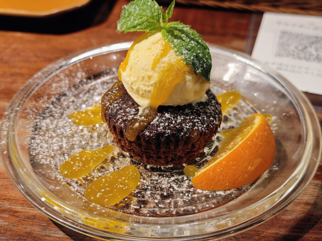 この日のドルチェは「フォンダンショコラ」でした。カットしたオレンジとオレンジのアイス、オレンジソースつき。