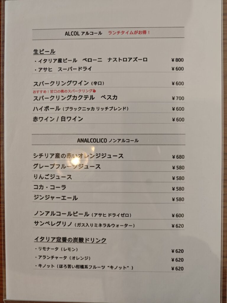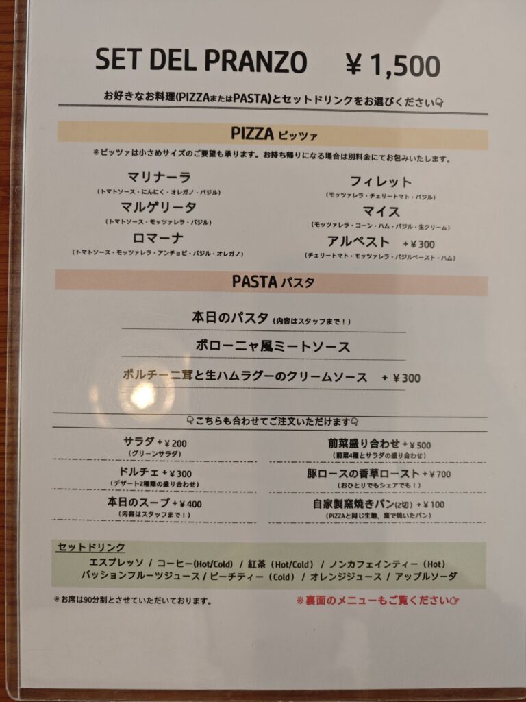 ランチは任意のピッツァorパスタ一品にドリンク付き。