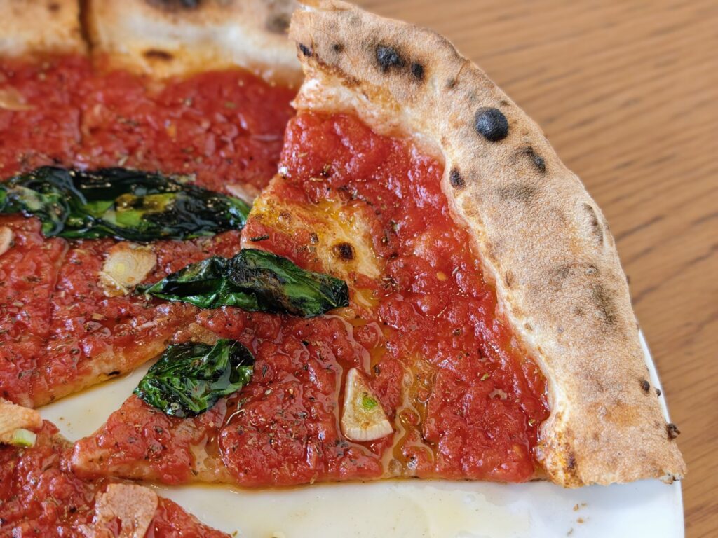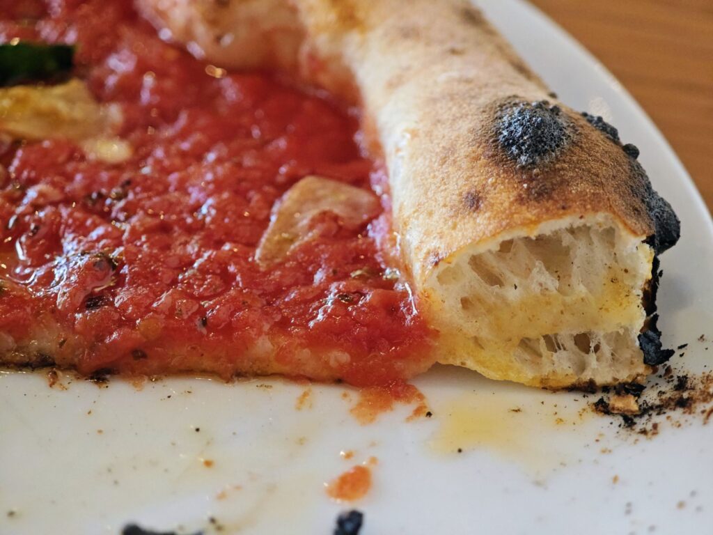 コルニチョーネ(縁)にはしっかりと高さがつけてあります。表面はザクザクとしたクランチーな皮になっており、内側にかけてはモチッとした生地の粘りとふっくら感が感じられます。