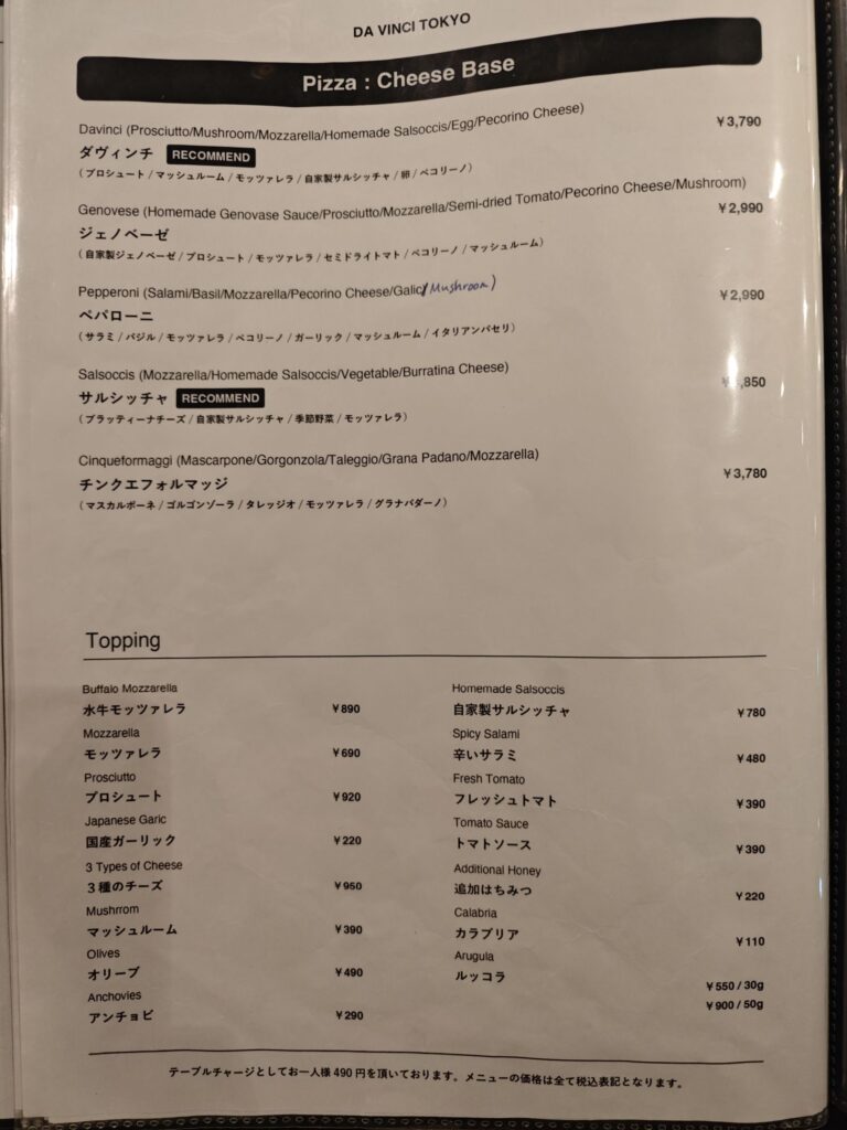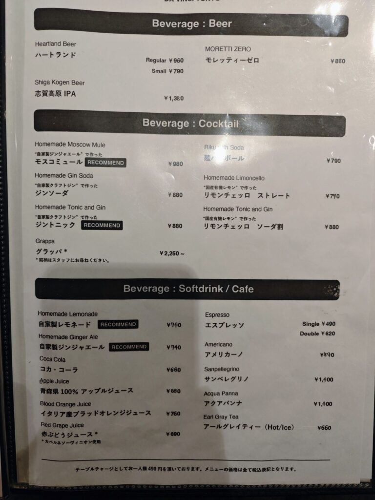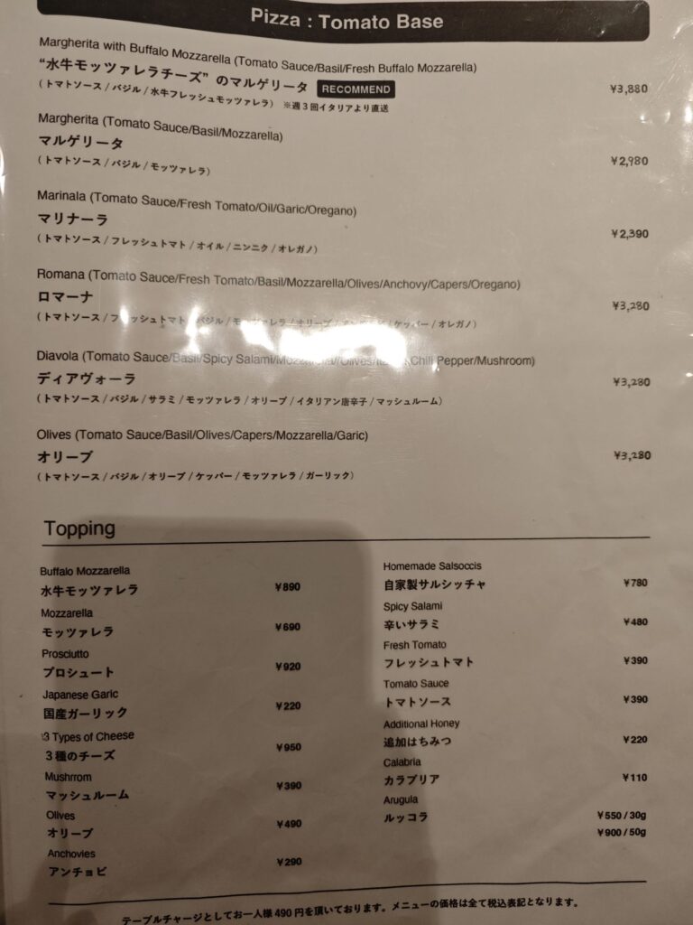 - ディナーはテーブルチャージあり(490円)