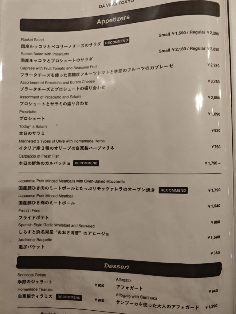 港区白金台らしくピッツァ1枚の価格レンジはおよそ2000円台後半~3000円台後半。都内の一般的な薪窯ピッツェリアと比較してもやや割高です。