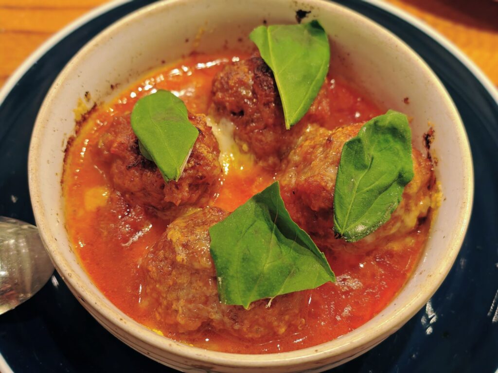 ゴロッと大きなミートボールが4つ入ったオーブン焼き。赤赤としたトマトソースとルッコラの緑のコントラストがなんとも綺麗。